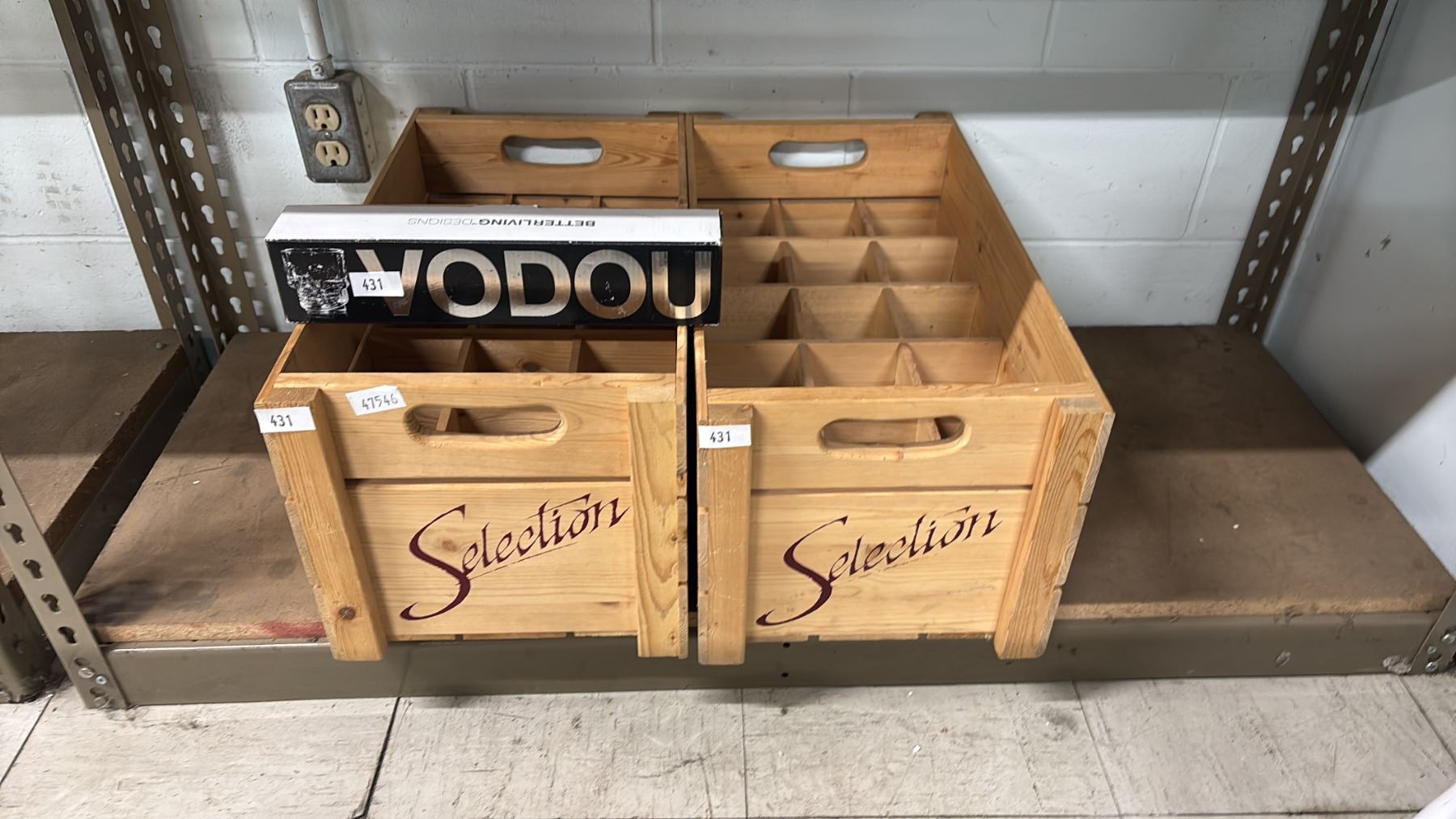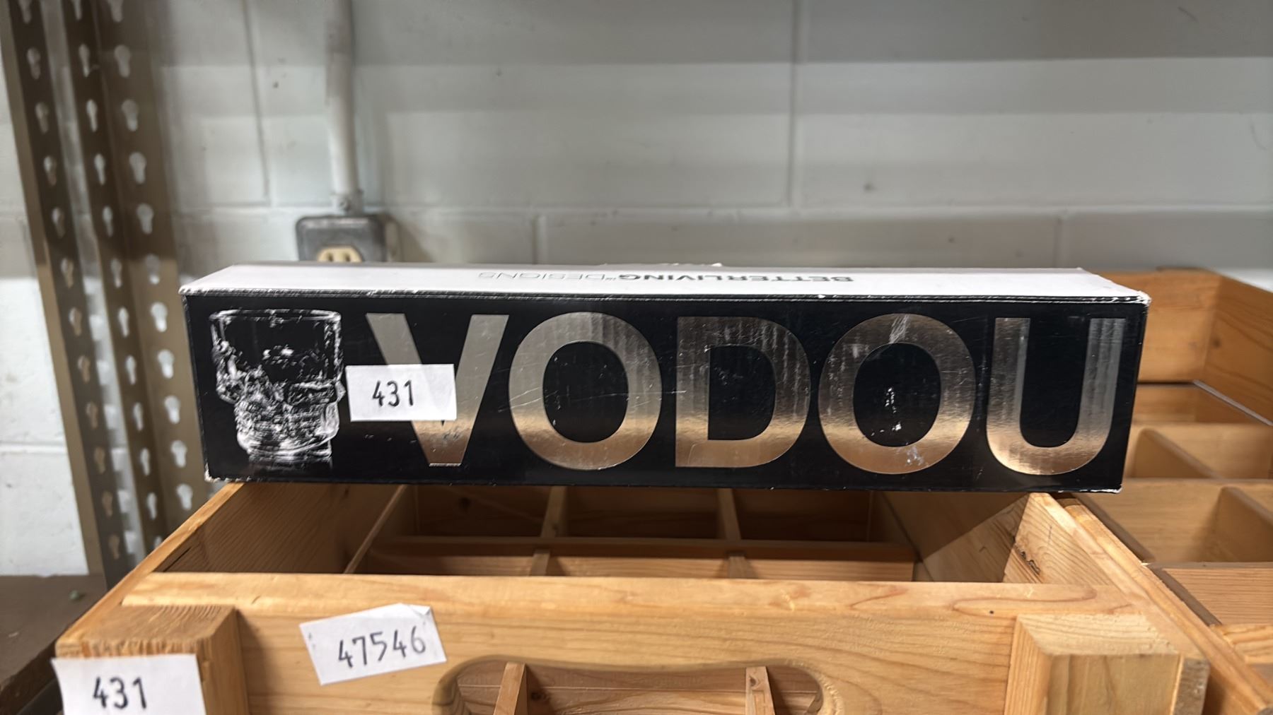 TWO WOODEN 18 SECTIONS CRATES & A BOX OF VODOU SKULL SHOT GLASSES