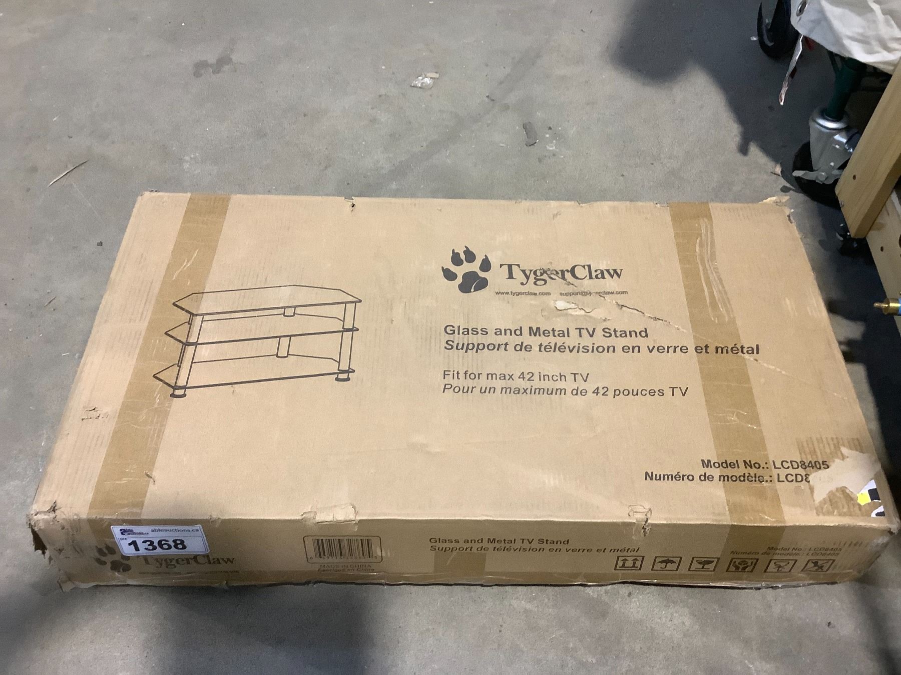 TYGER CLAW GLASS AND METAL TV STAND (MAY BE MISSING PIECES)