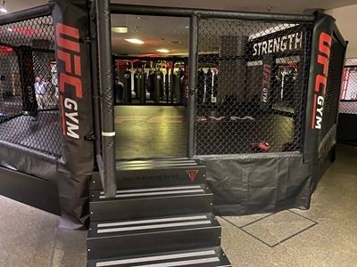UFC OCTAGONAL FIGHT CAGE, APPROX. 30' ACROSS WITH PADDED WALLS AND STAIRS