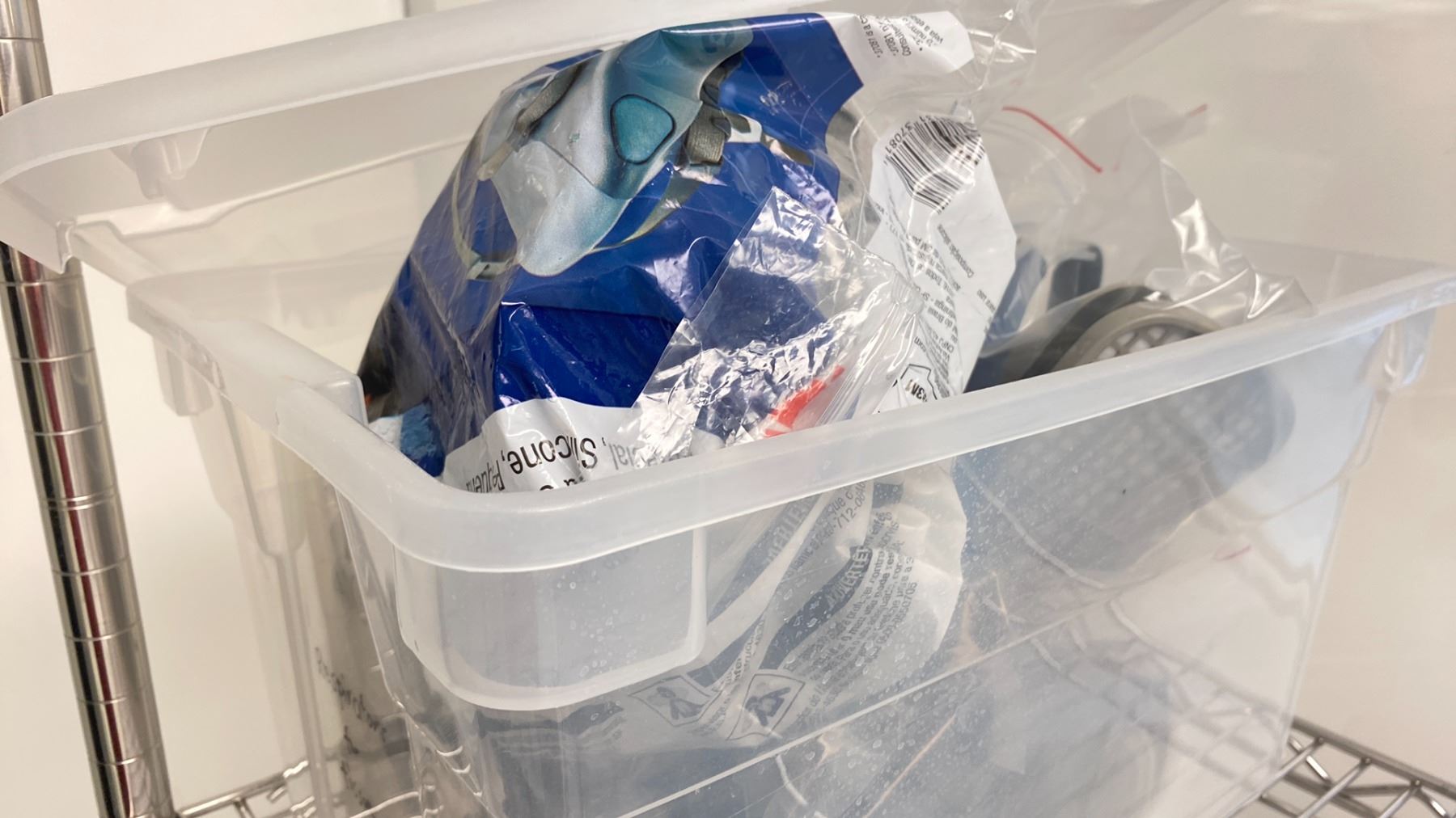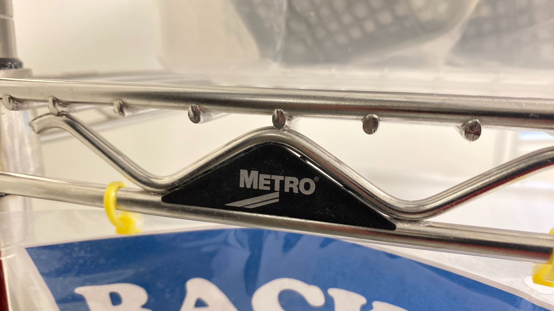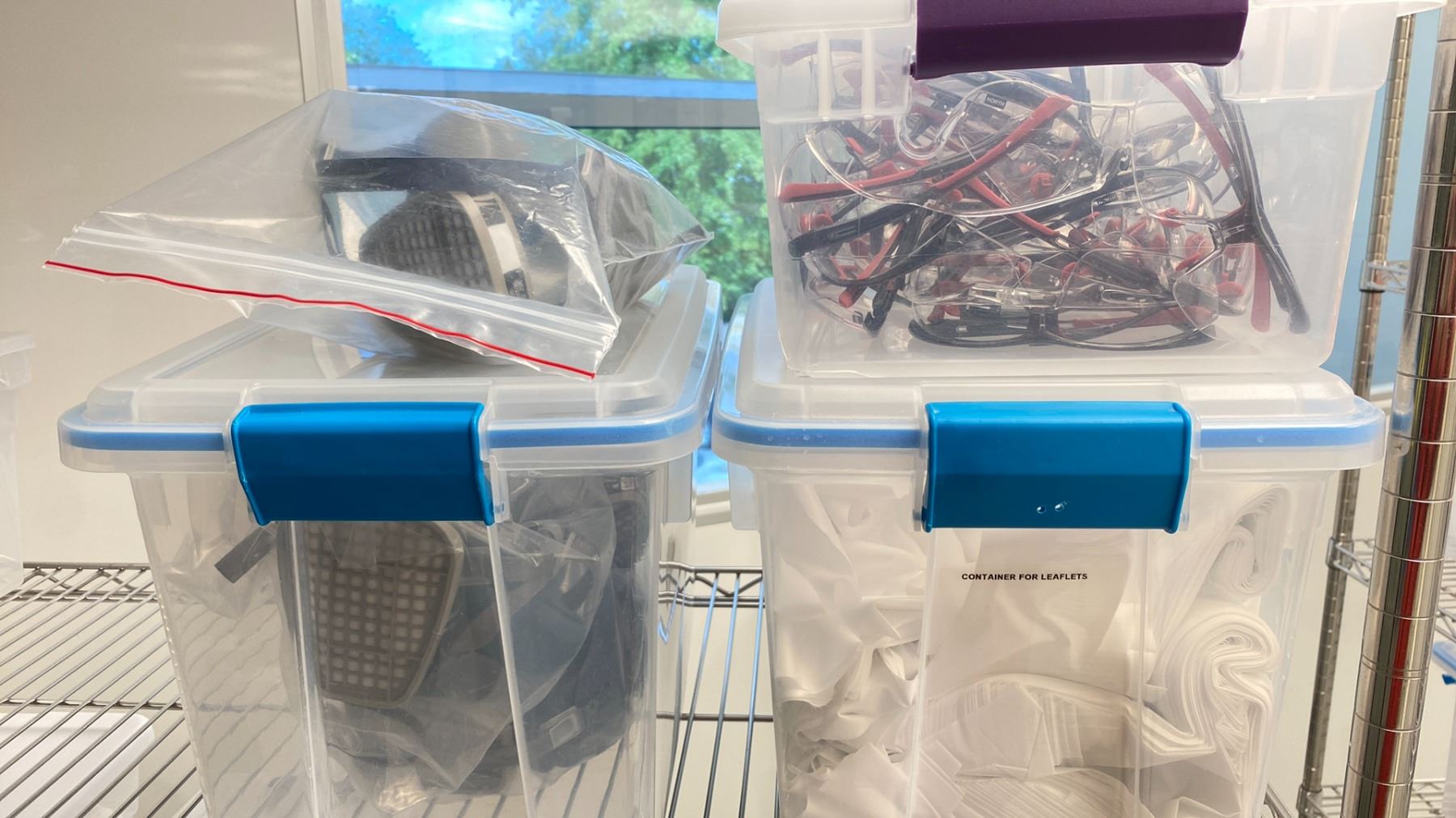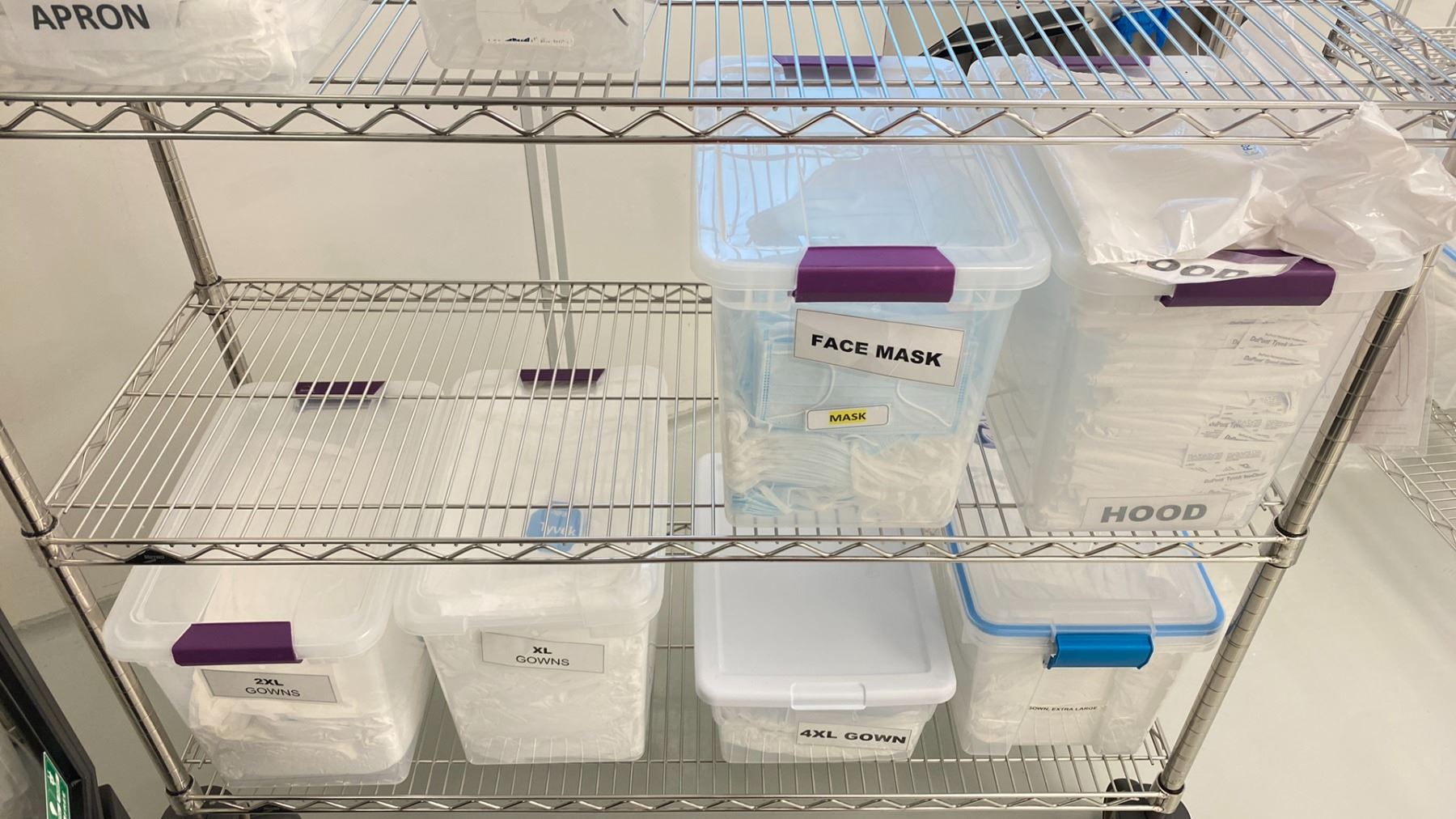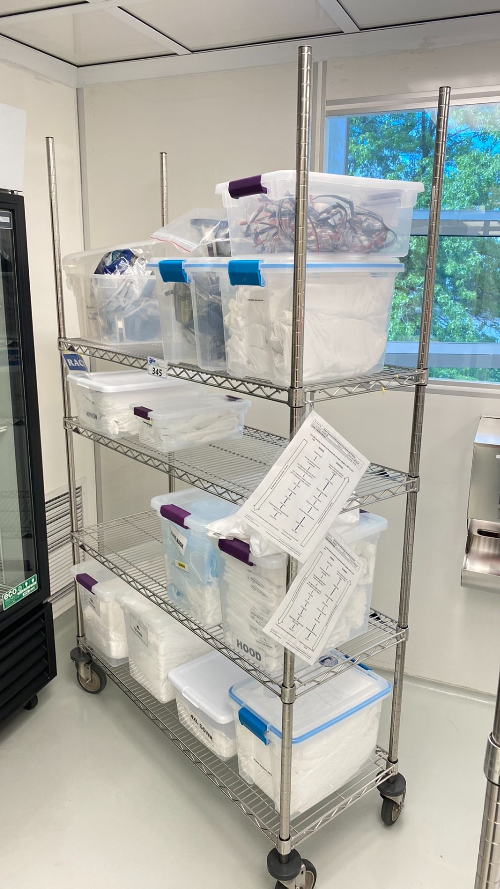 ULINE 4 TIER METAL MOBILE RACK WITH ASSORTED MASKS AND CLEANROOM GOWNS