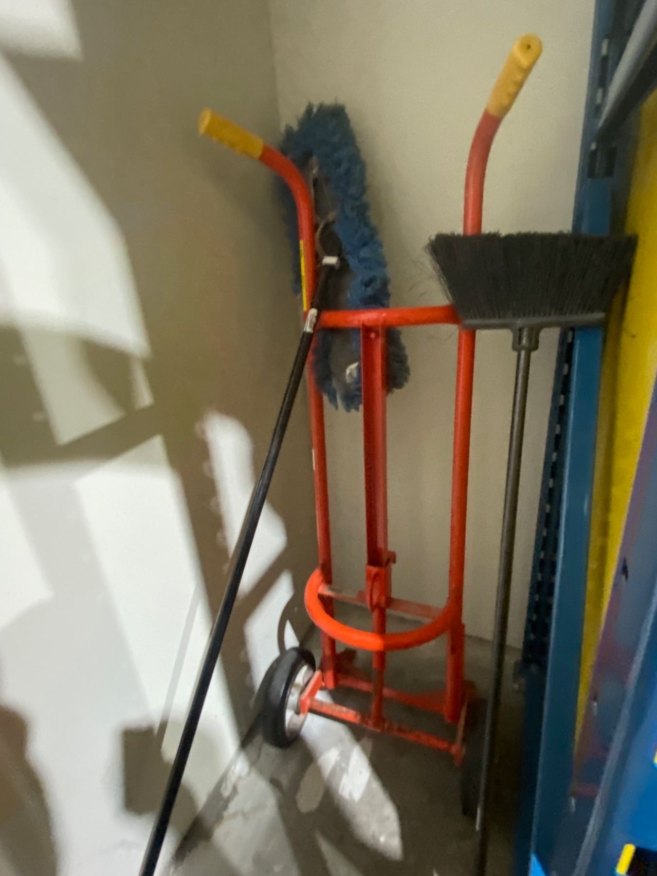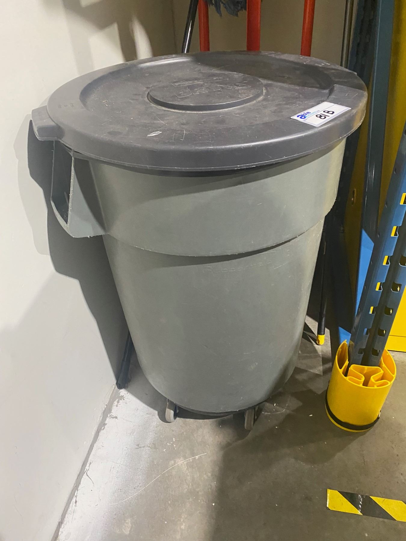 ULINE BARREL DOLLY, ROLLING GARBAGE BIN AND ASSORTED MOPS