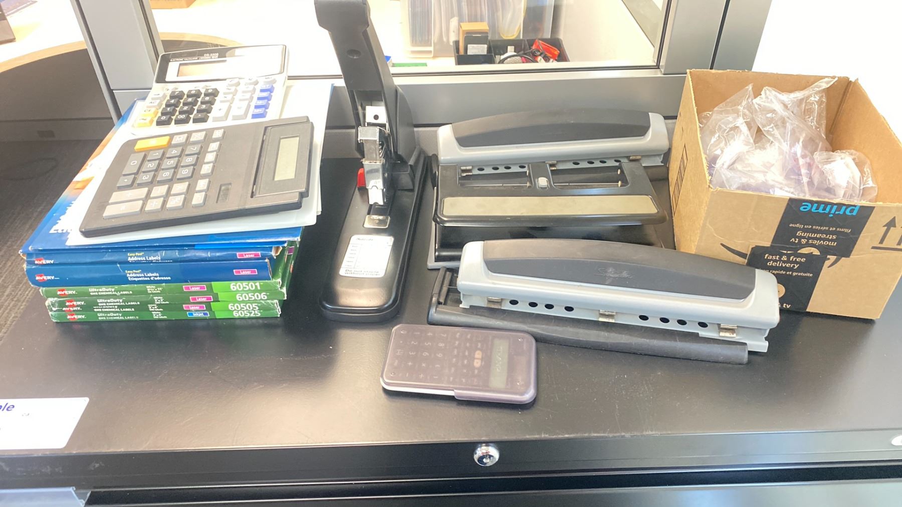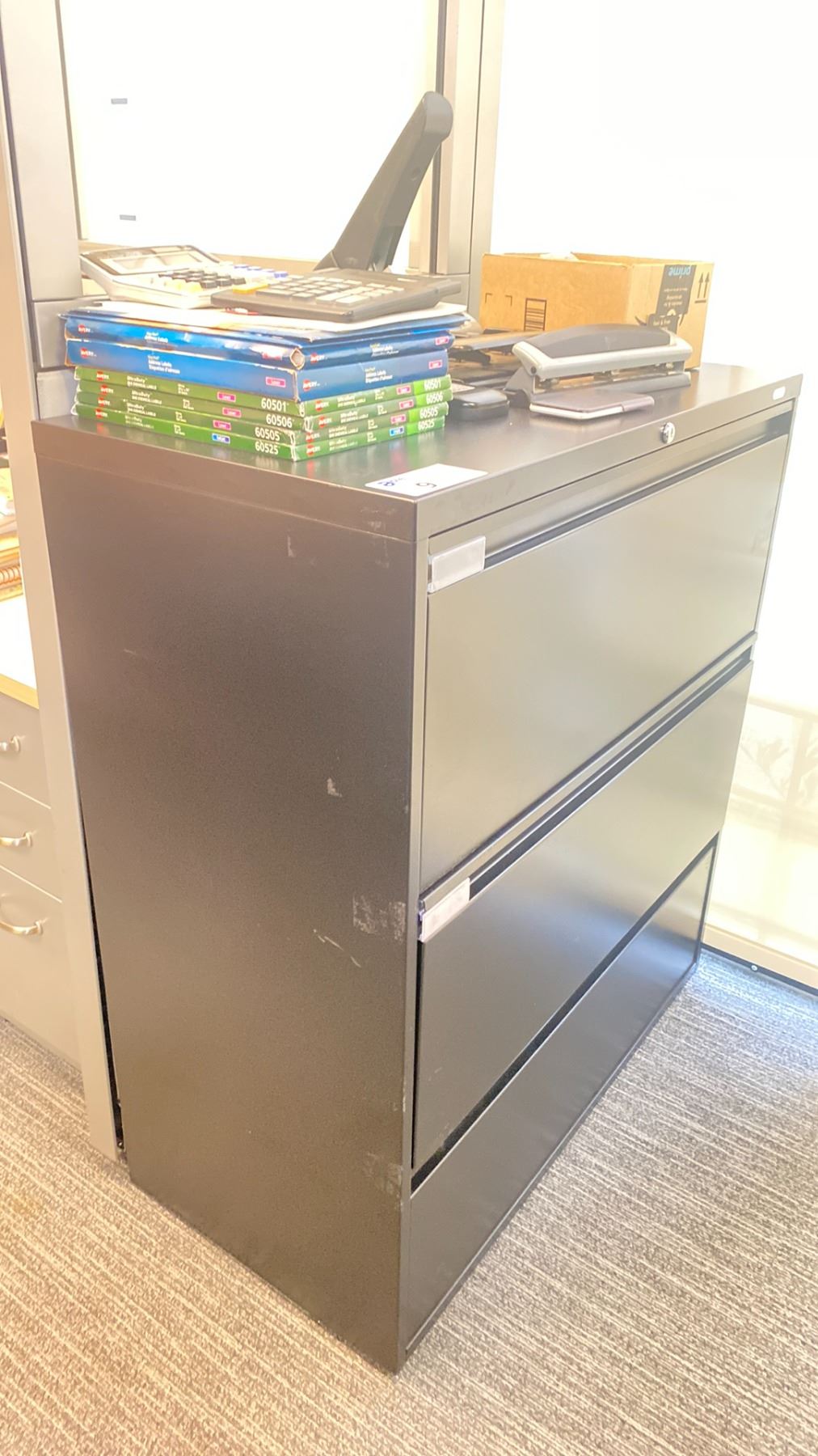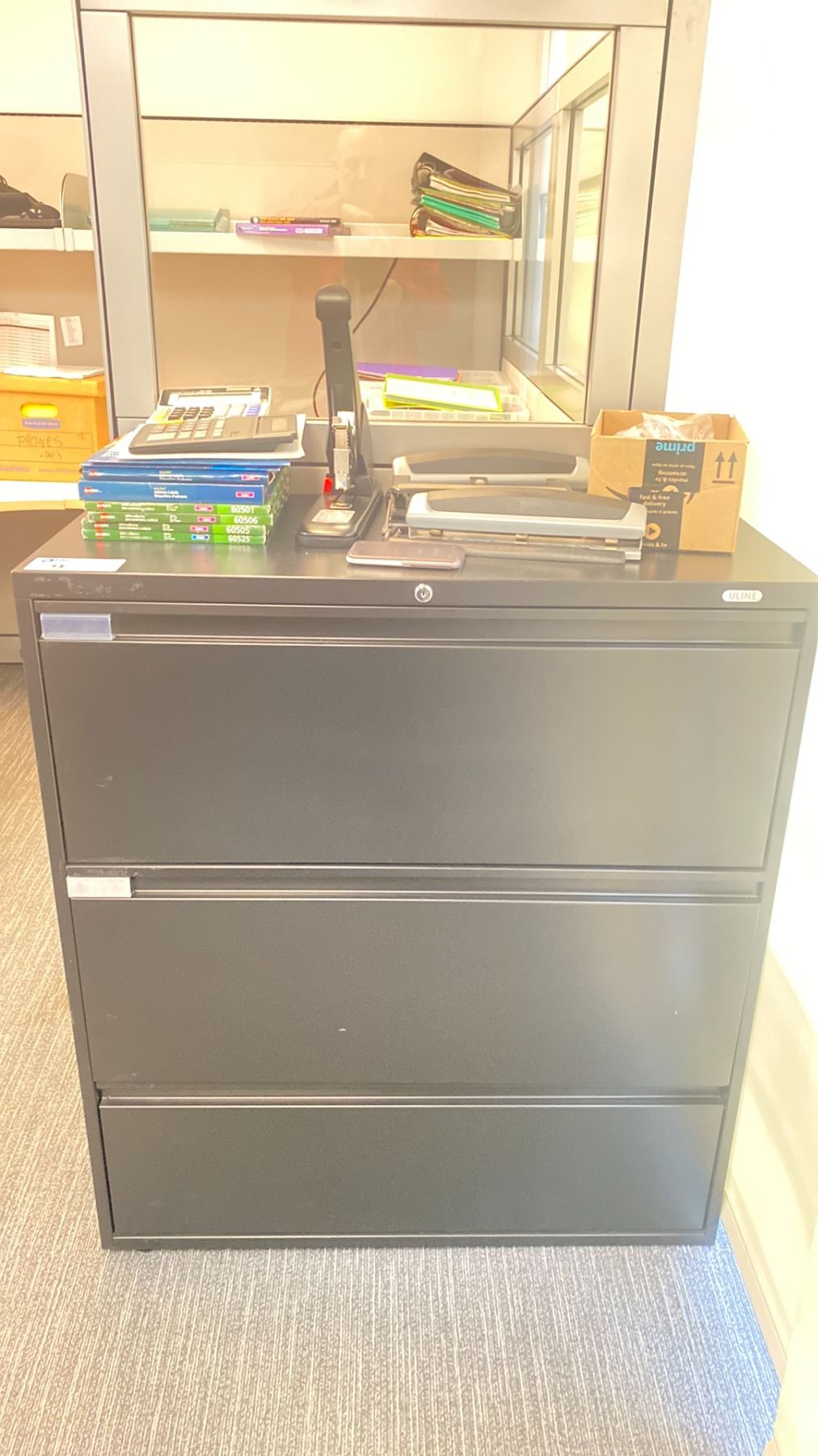 ULINE BLACK 3 DRAWER LATERAL STORAGE CABINET WITH ASSORTED OFFICE CONTENTS