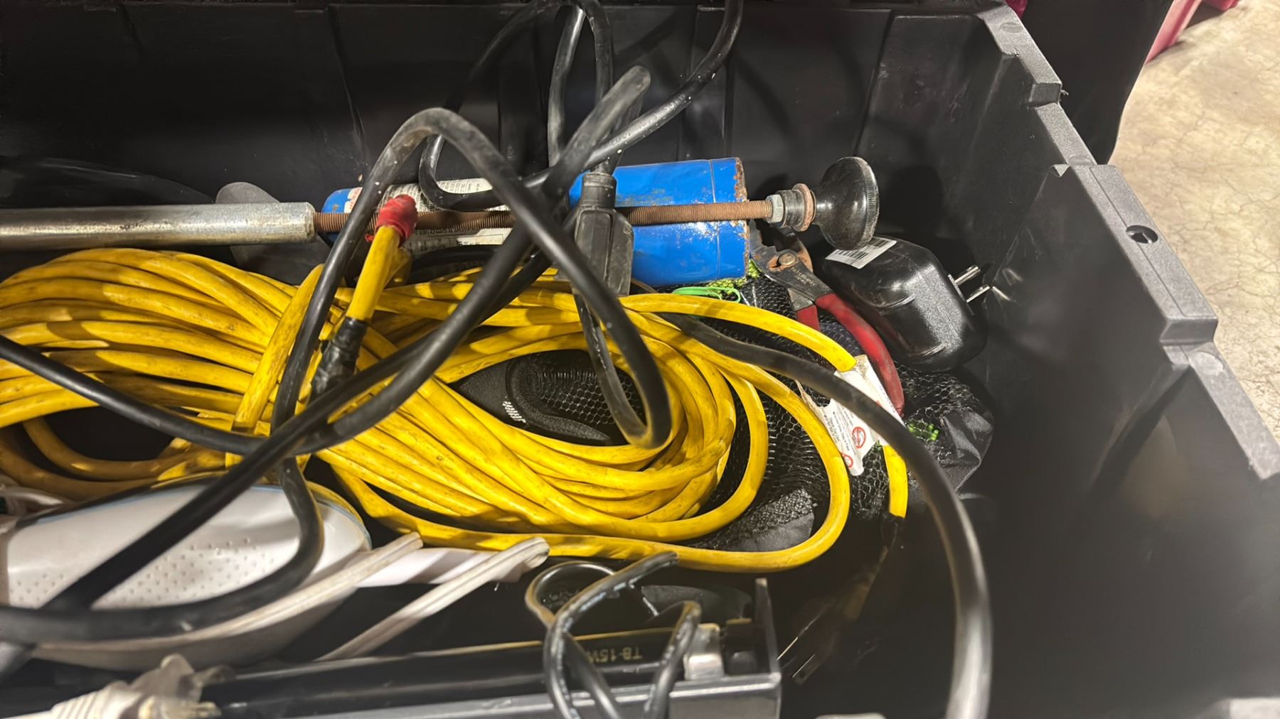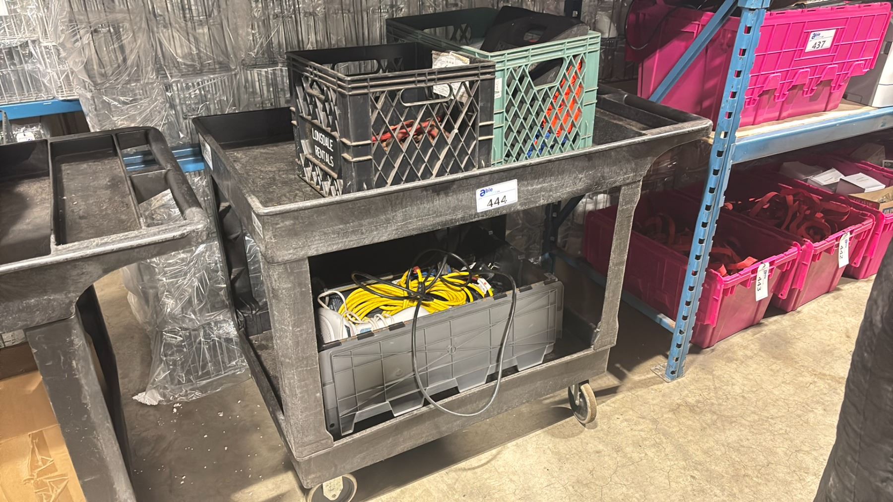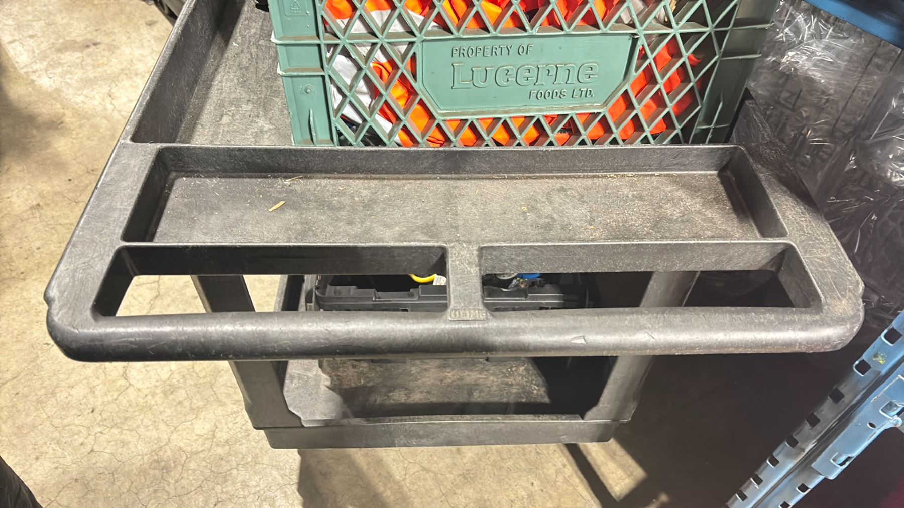 ULINE BLACK PLASTIC 2 TIER PRODUCT CART W/ 3 CRATES OF MISC TOOLS *CRATES INCLUDED*