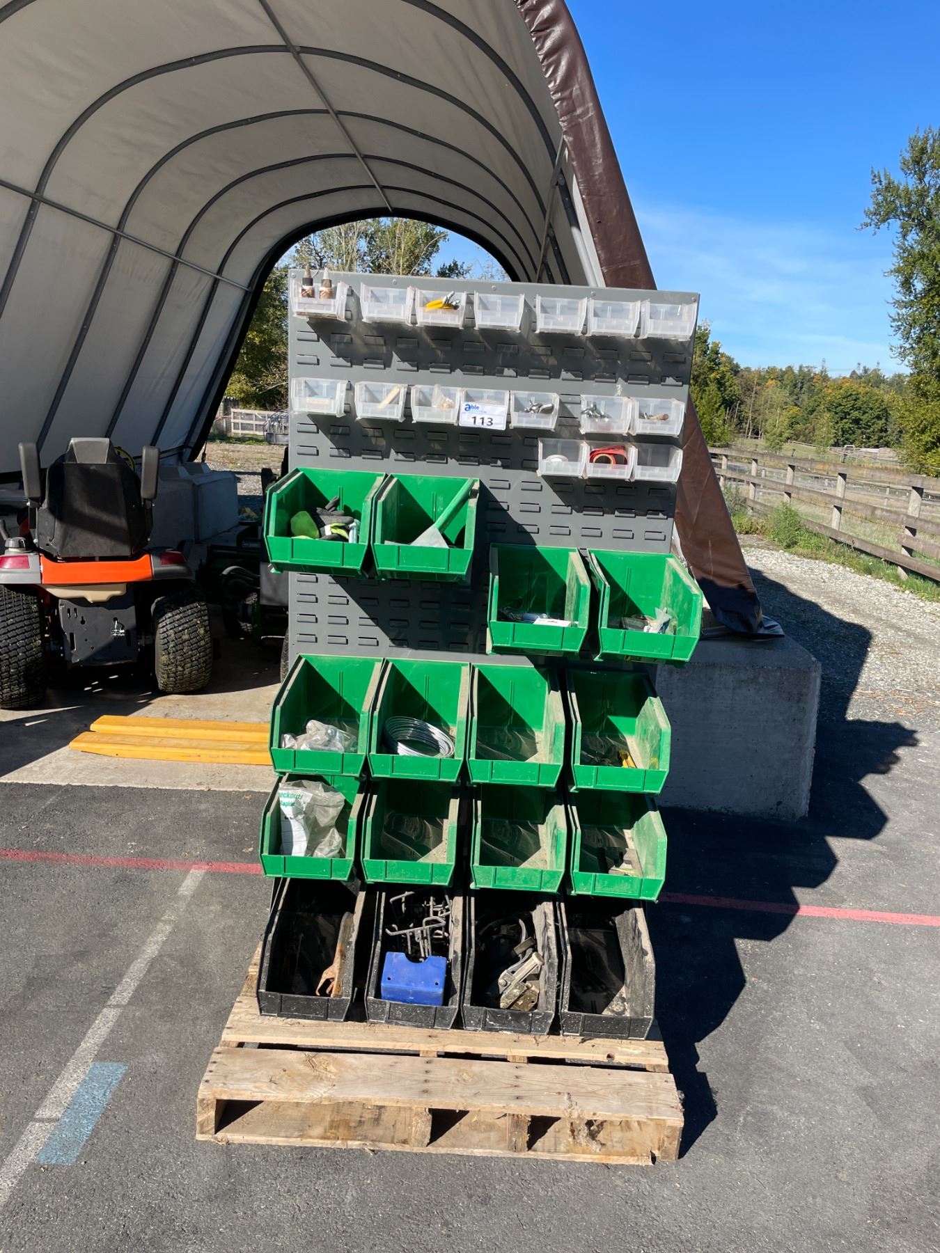 ULINE GREY METAL PARTS BINS WITH ASSORTED HARDWARE