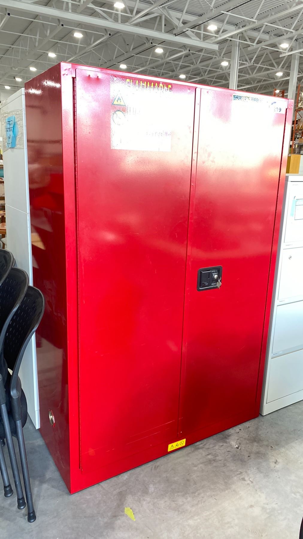 ULINE H-1564S-R FLAMMABLE LIQUID STORAGE CABINET WITH SHELVES & KEY 43" X 18" X 65"H