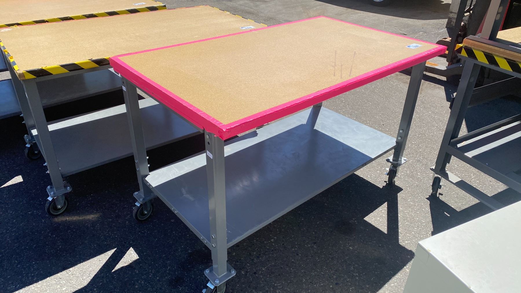 ULINE WOOD TOP METAL FRAME MOBILE HEIGHT ADJUSTABLE PACKING TABLE WITH FULL BOTTOM SHELF (60"W 36"D 37"H)