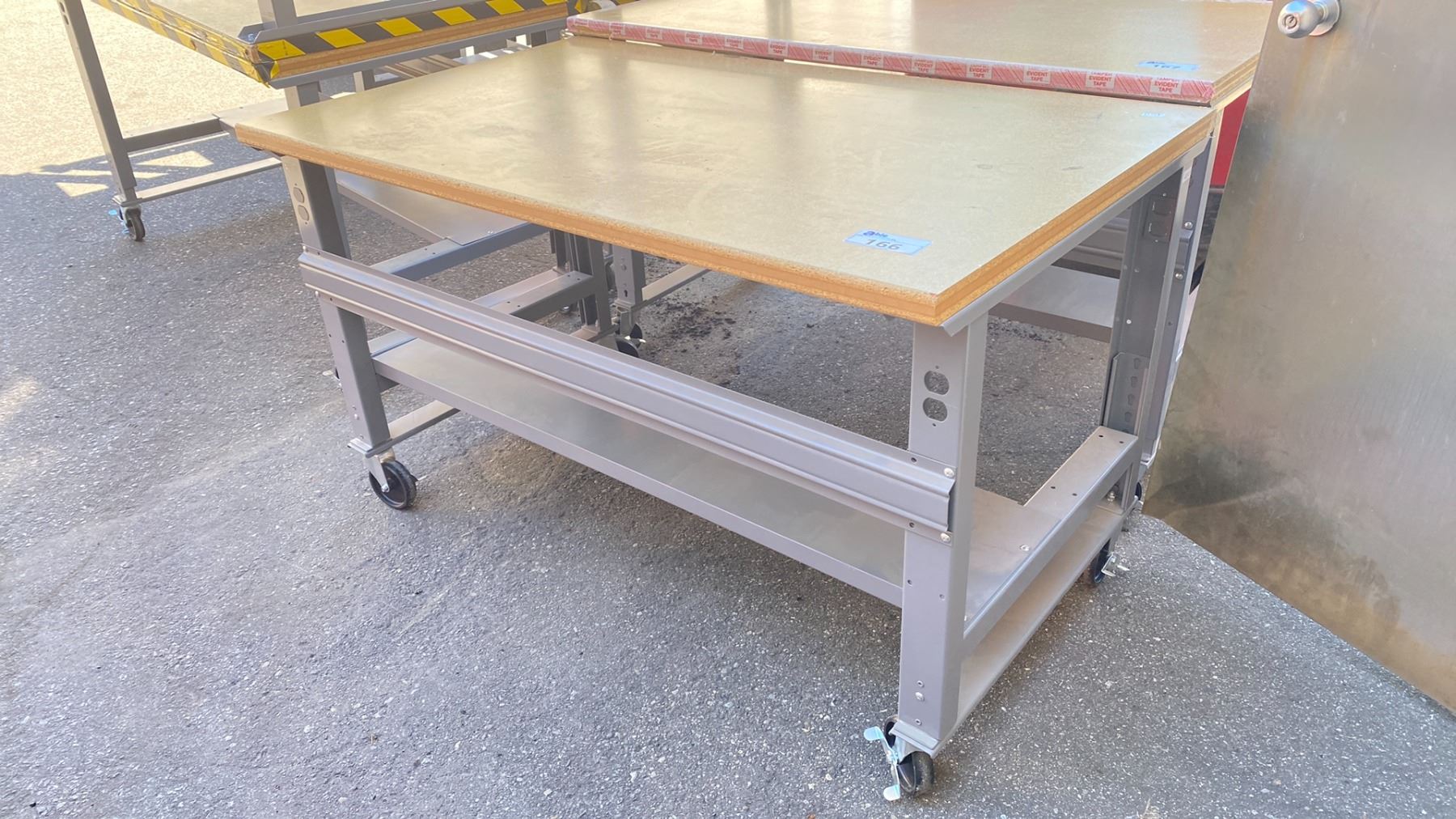 ULINE WOOD TOP METAL FRAME MOBILE HEIGHT ADJUSTABLE PACKING TABLE WITH HALF BOTTOM SHELF (60"W 36"D 38"H)