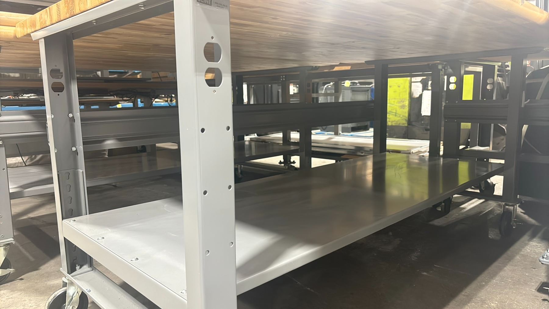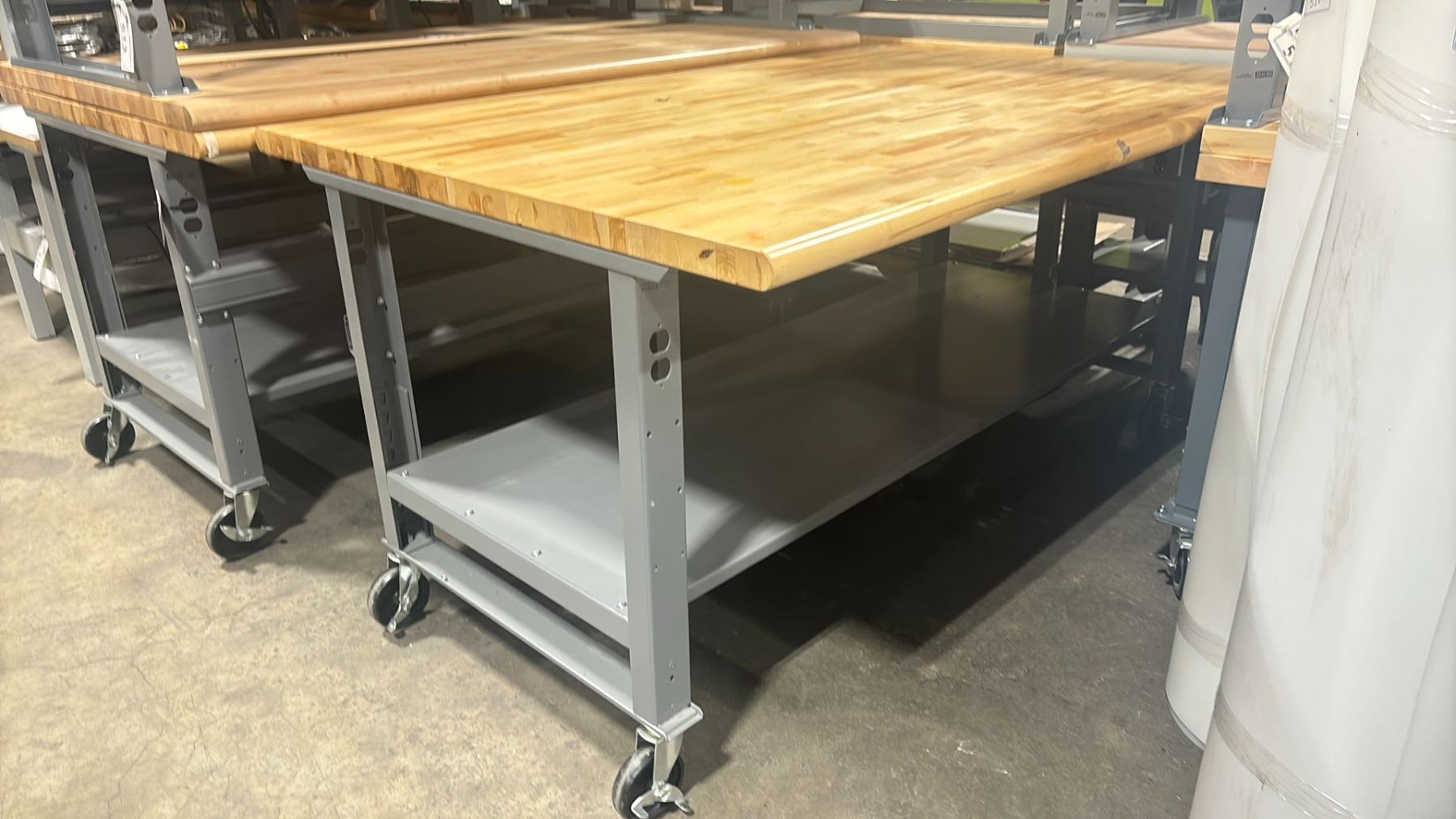 ULINE WOODEN/METAL HEIGHT ADJUSTABLE PACKING TABLE WITH POWER OUTLETS (72"W X 30"D X 34"H)