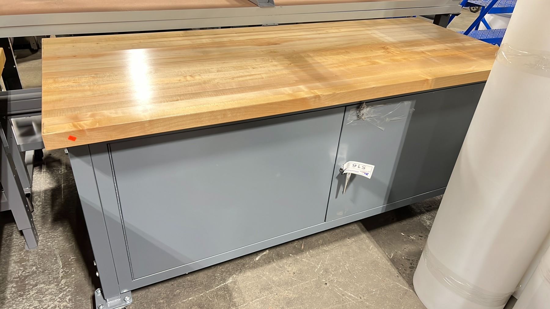 ULINE WOODEN/METAL MOBILE HEIGHT ADJUSTABLE PACKING TABLE WITH STORAGE CABINETS (72"W X 30"D X 34.5"H)