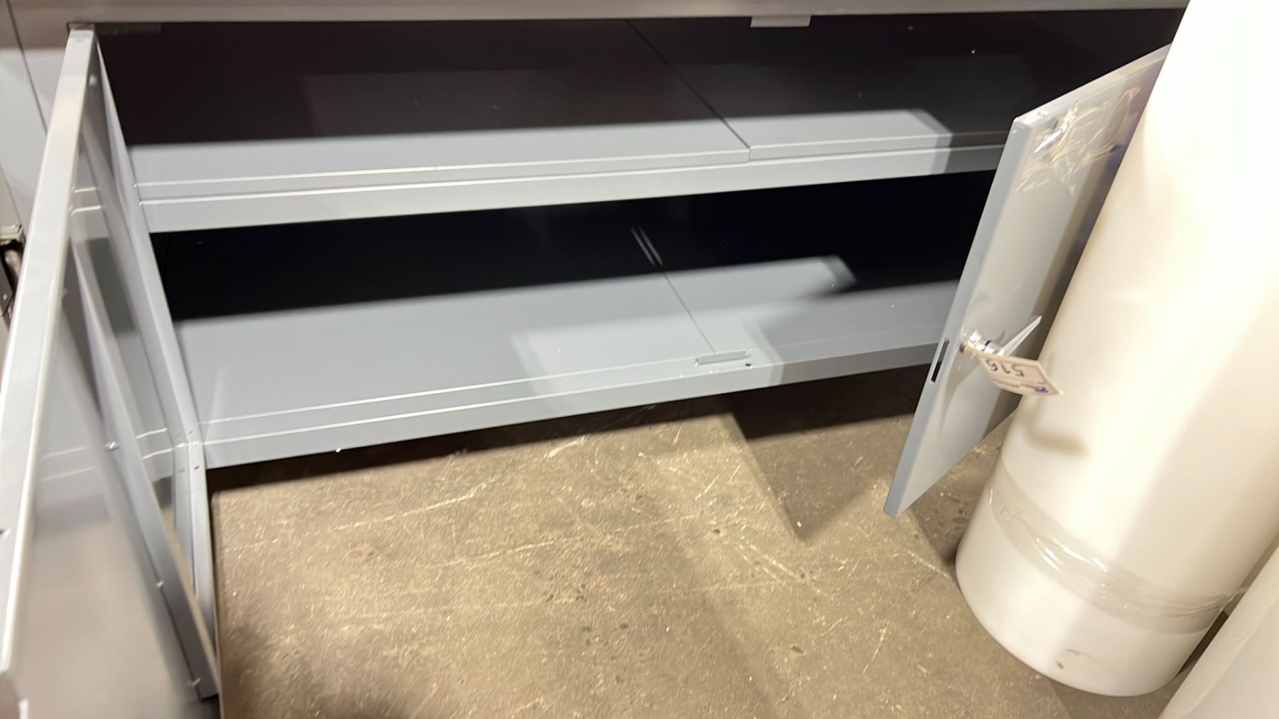 ULINE WOODEN/METAL MOBILE HEIGHT ADJUSTABLE PACKING TABLE WITH STORAGE CABINETS