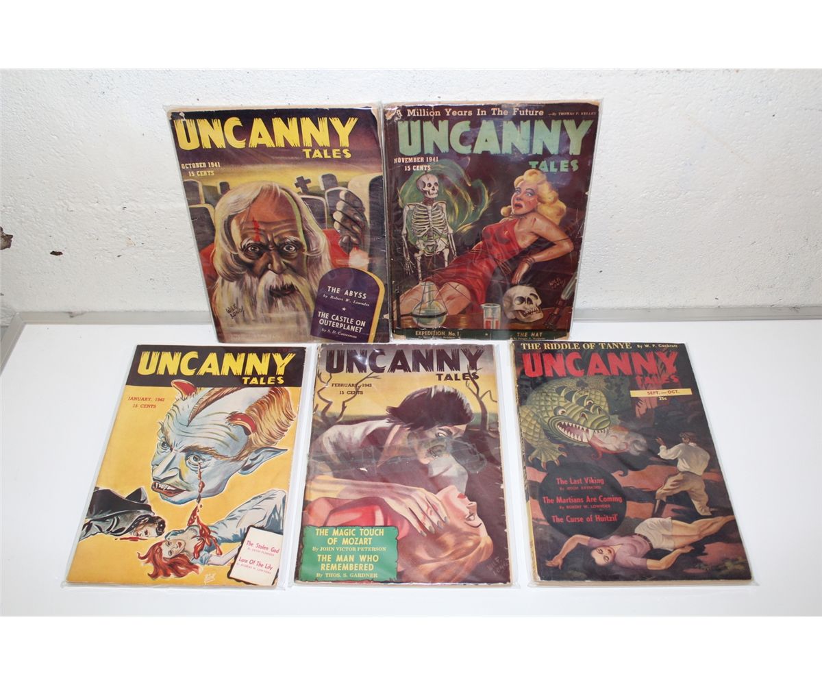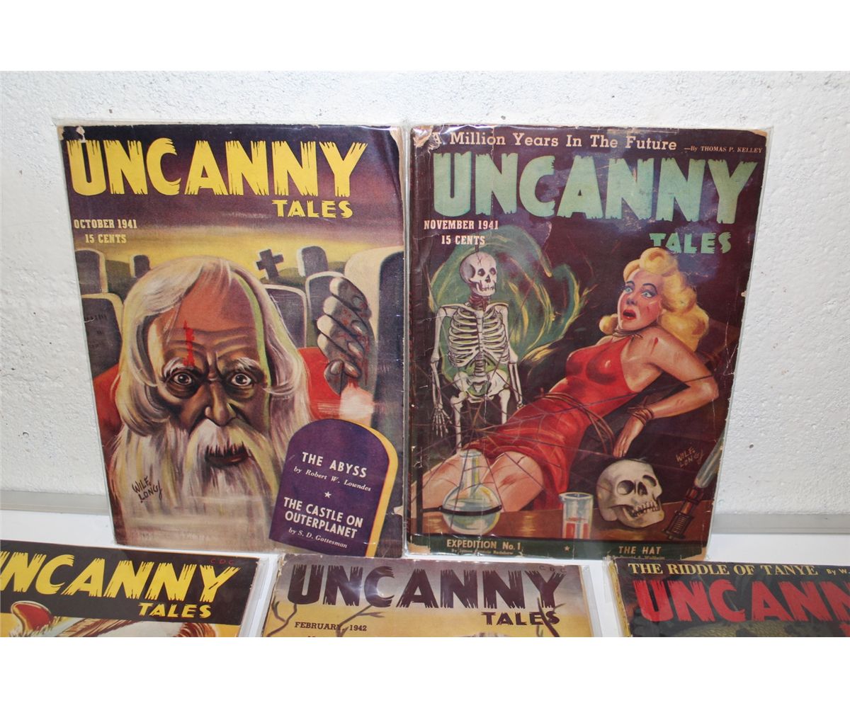 UNCANNY TALES CANADIAN PULP RUN (1941-43) AWESOME PAINTED COVERS & SENSATIONAL CONTENT. 6 ISSUES I IN NICE GD - FN RANGE. NICE & SUPPLE WITH NICE SPINES!