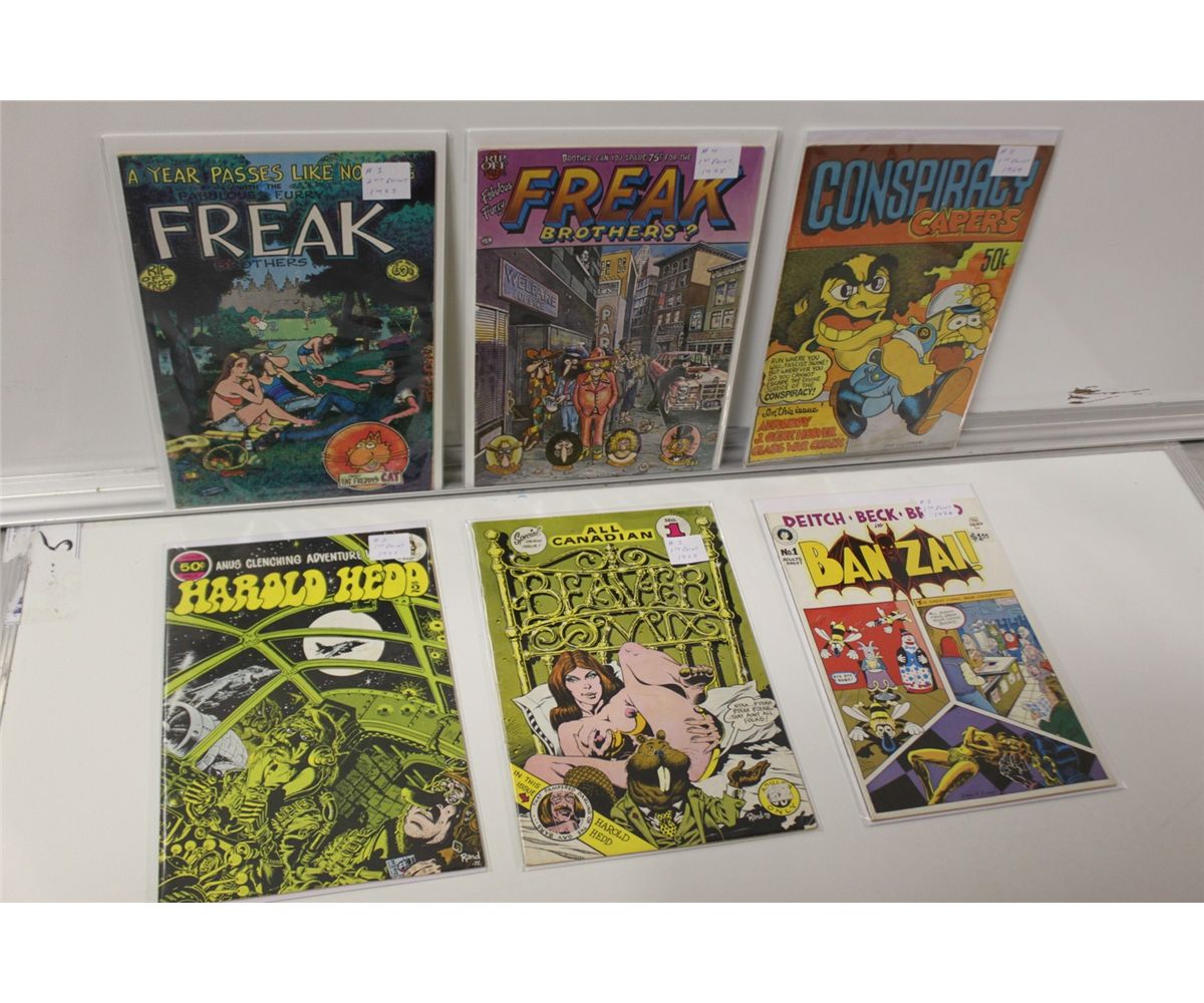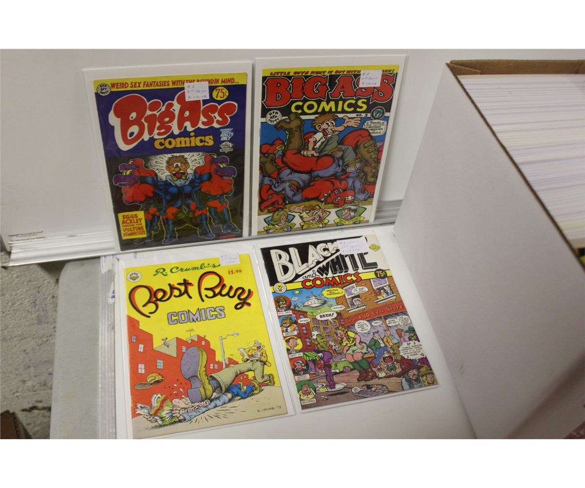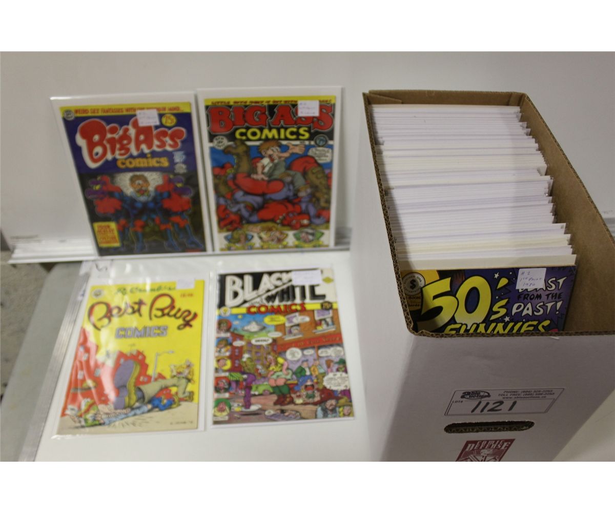 UNDER GROUND COMIX SHORT BOX.  MOSTLY SILVER & BRONZE OBSCURE & LEWID TITLES.  MOST ARE 1ST PRINTS & LOW PRINT.  MIXED GRADES, MANY SHARP.  FOGEL'S COMIX TOP END GUIDE VALUE OF OVER $1,200.  18 YEARS +