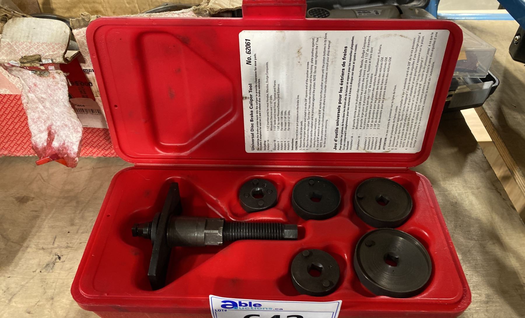 UNIVERSAL BRAKE CALIPER IN HARD TRANSPORT CASE, ELECTRIC OSCILLATING TOOL IN HARD TRANSPORT CASE, & BOX OF CAR PARTS