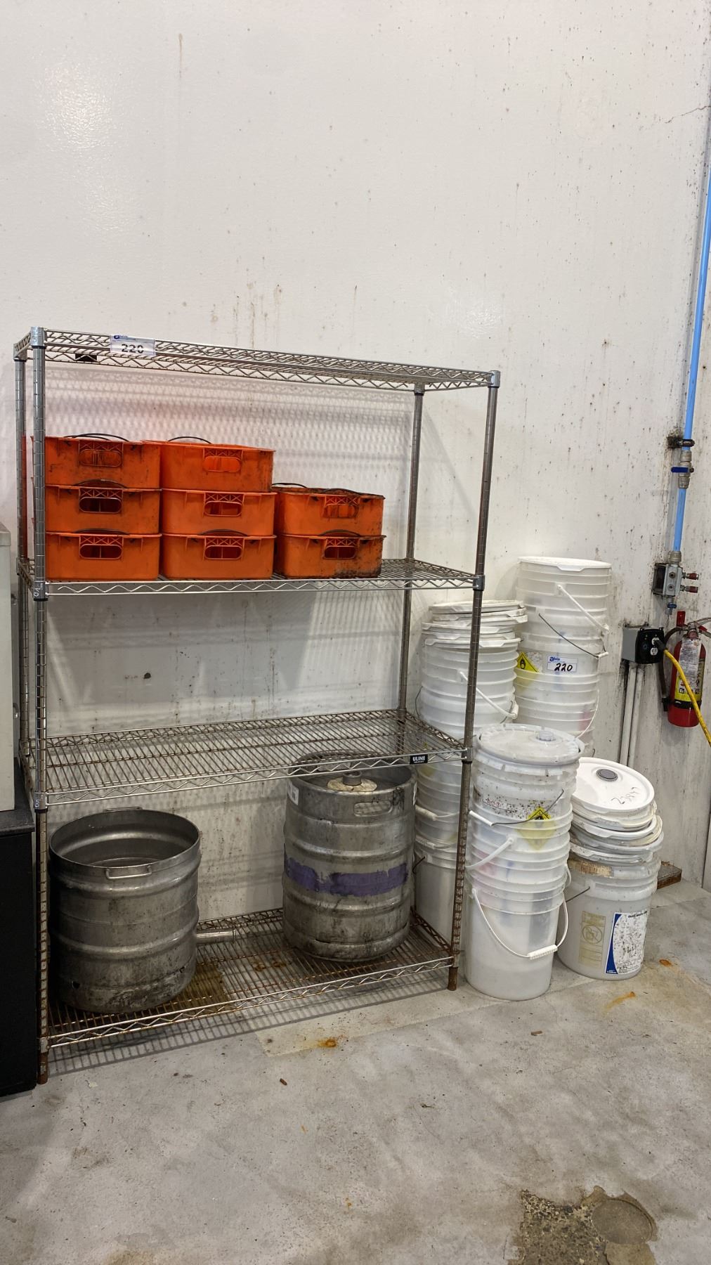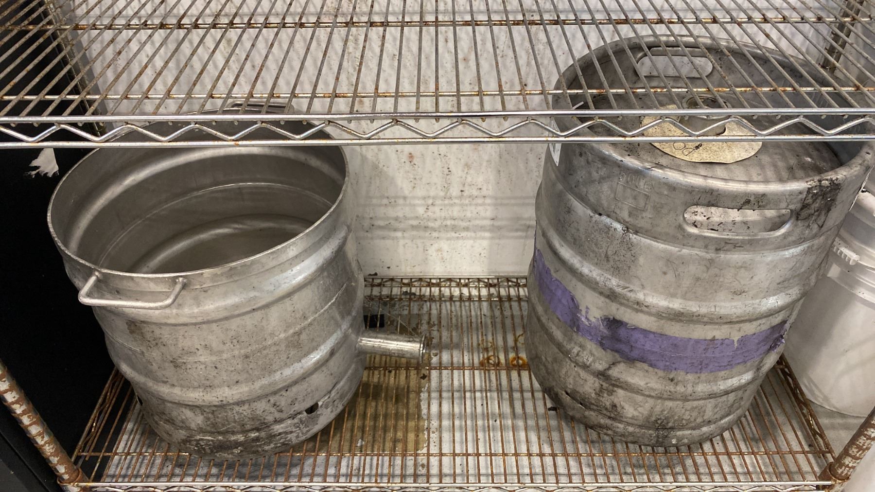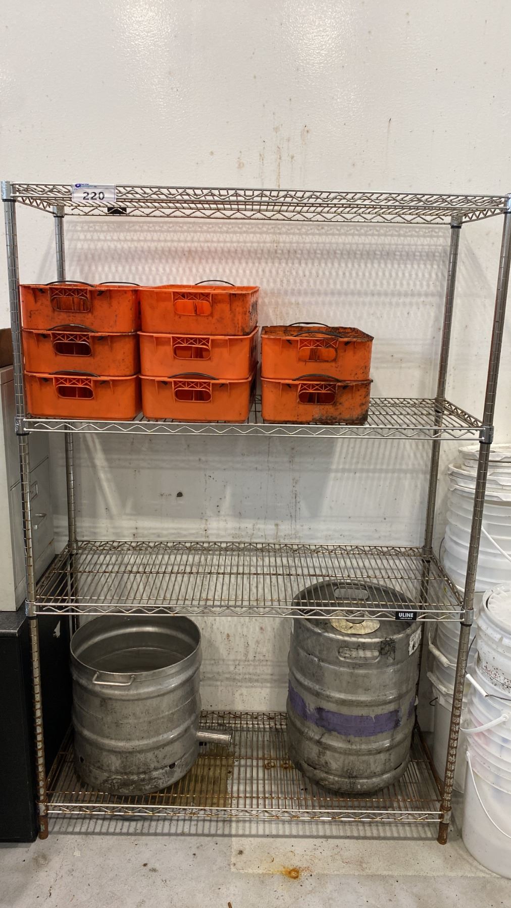 UNLINE 4 TIER METAL SHELF UNIT AND CONTENTS - PIC-A-POP PLASTIC TRAYS, BUCKETS (1) 50 LITRE KEG AND 2 MODIFIED BEER KEGS