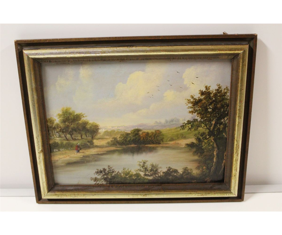 UNSIGNED (ENGLISH, CIRCA 1840) OIL ON BOARD. LANDSCAPE WITH FIGURE AND POND 9" X 12"