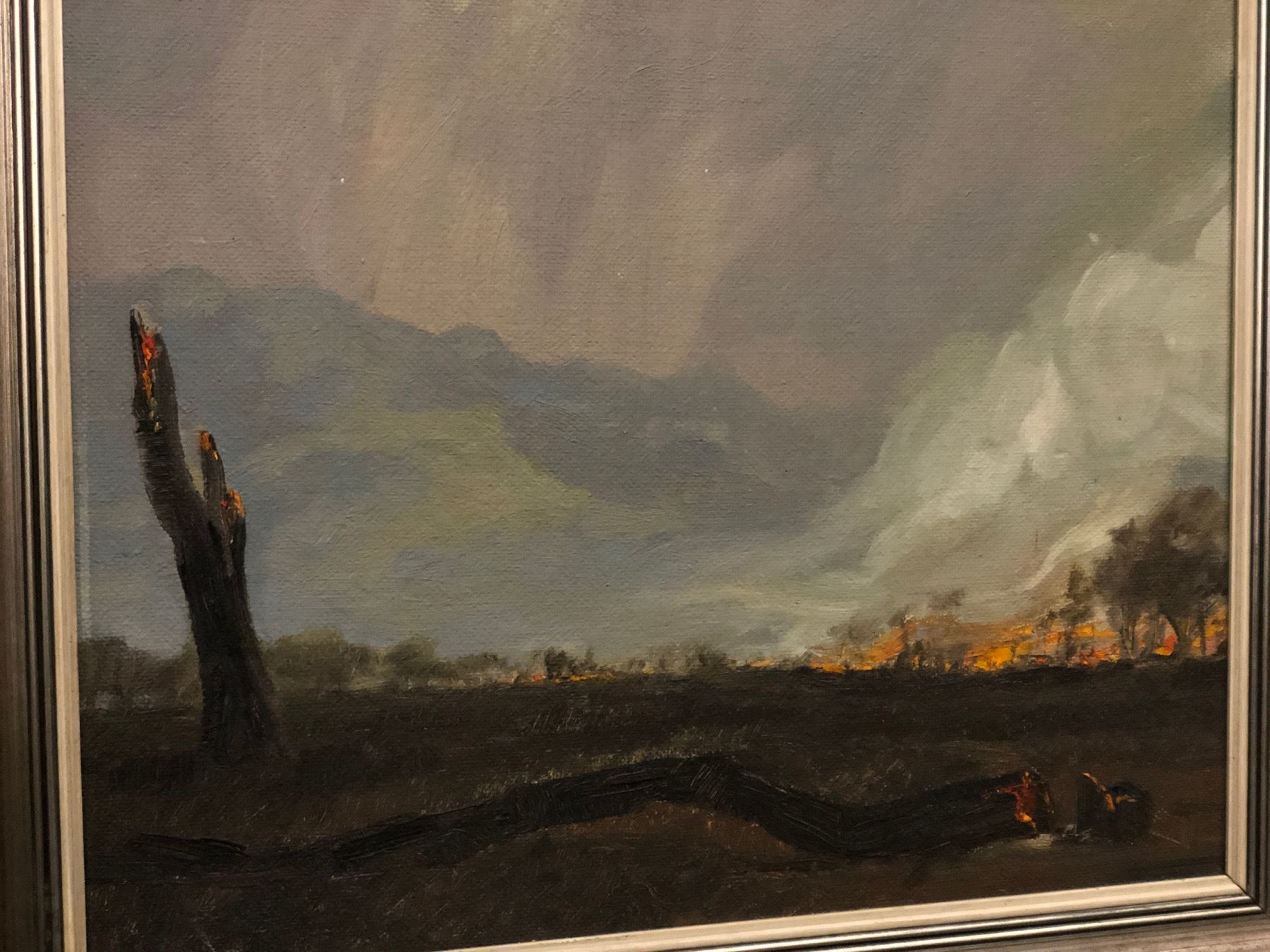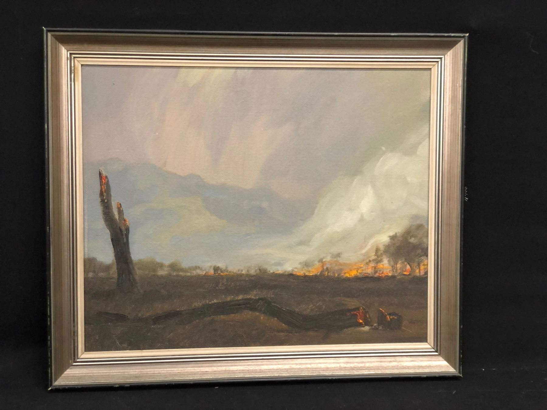 UNTITLED FRAMED OIL ON BOARD PAINTING, ARTIST UNKNOWN, ABSTRACT WILDFIRE SCENE, 19.5'' X 23.5''