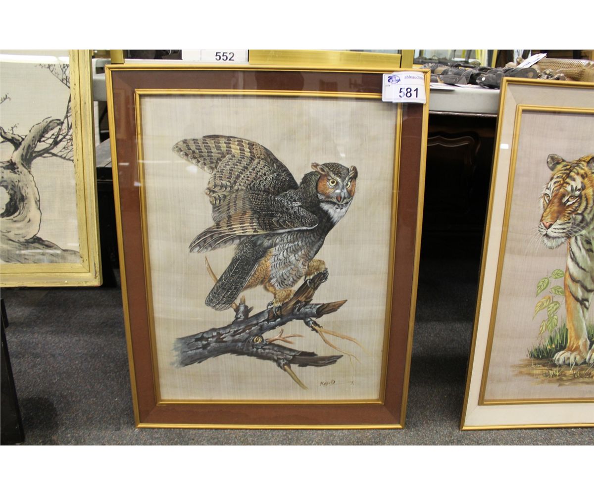 "UNTITLED- OWL" ACRYLIC ON SILK 19" X 26" SIGNED LOWER RIGHT