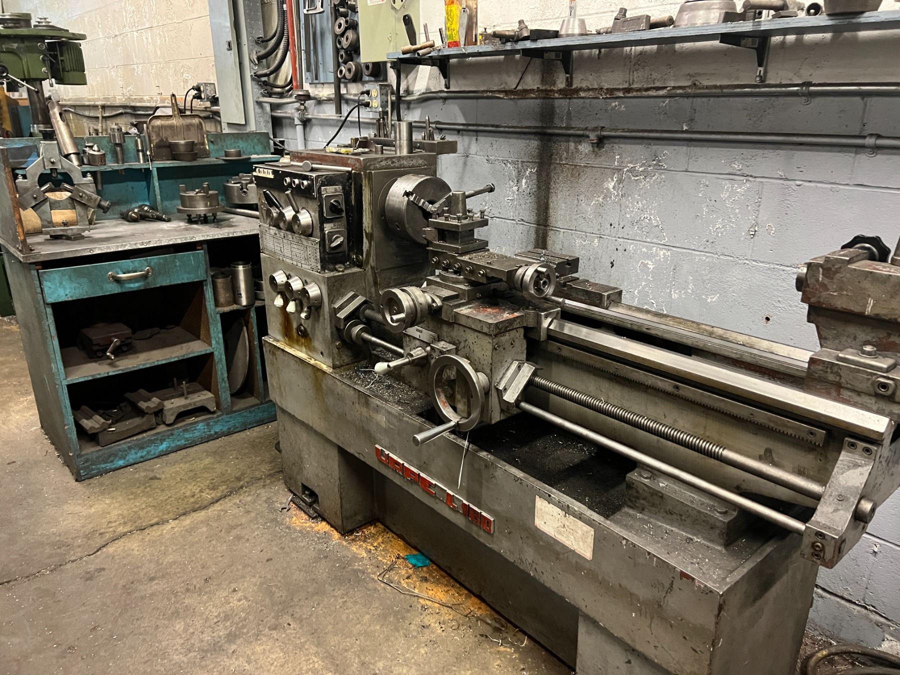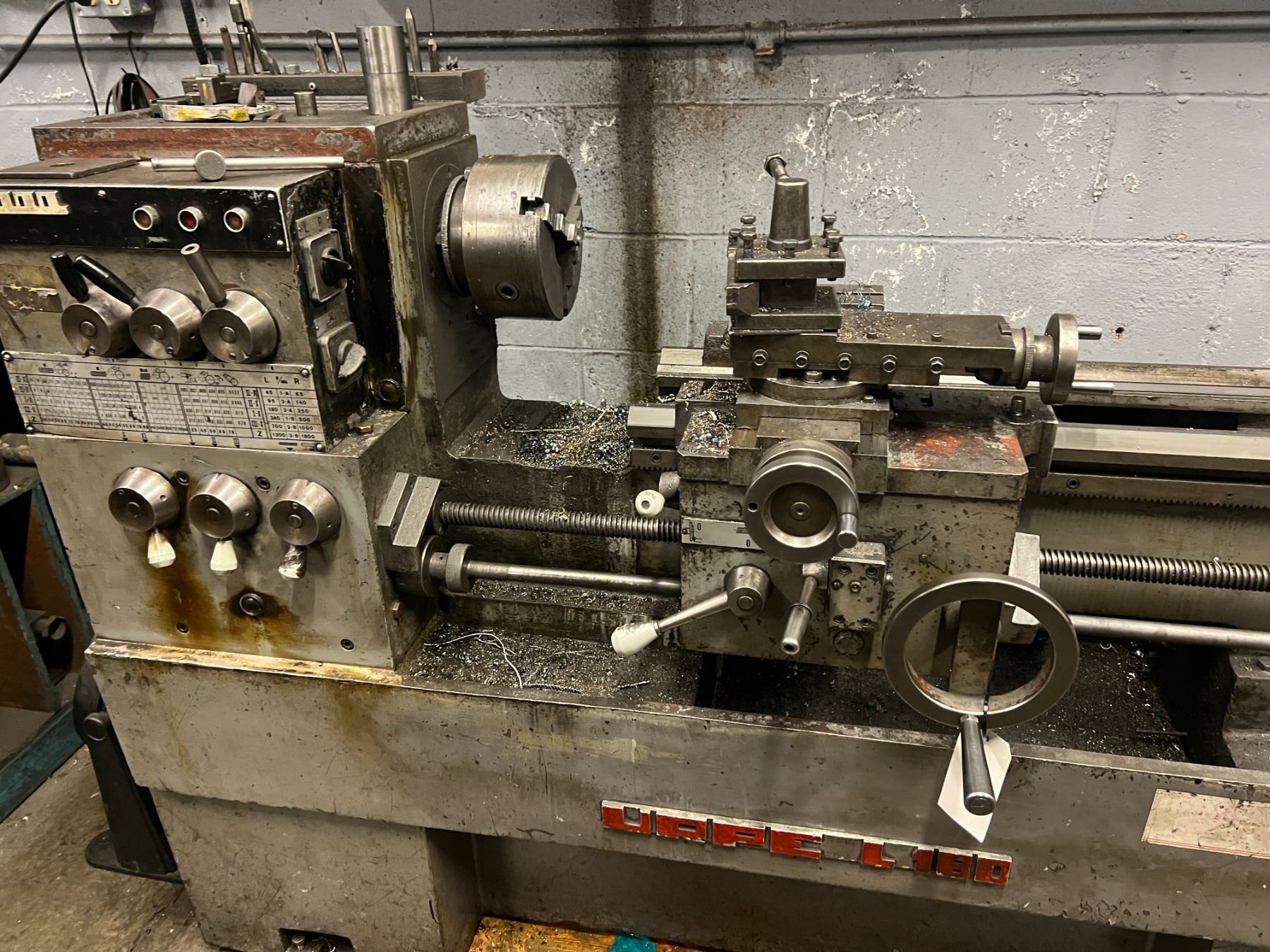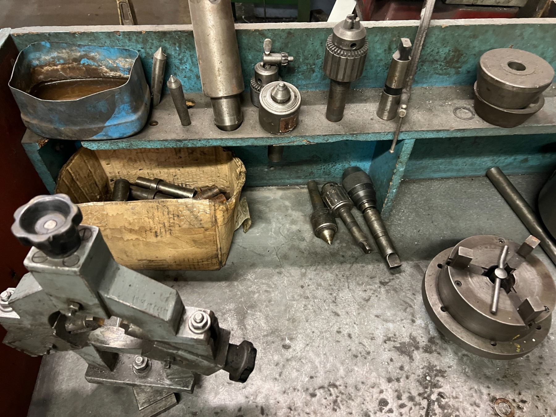 URPE L180 SINGLE DIRECTIONAL LATHE. 3HP 3 PHASE. COMES WITH 2X3 JAW, 4 JAW CHUCKS, STEADIES, VARIOUS CENTERS, ACCESSORIES & SMALL WORK BENCH