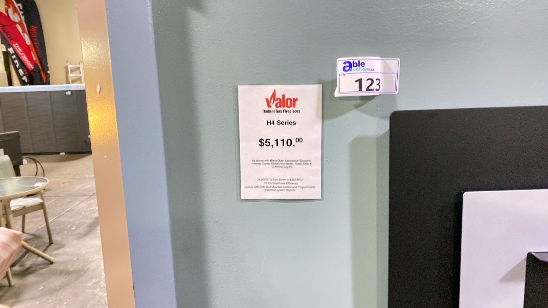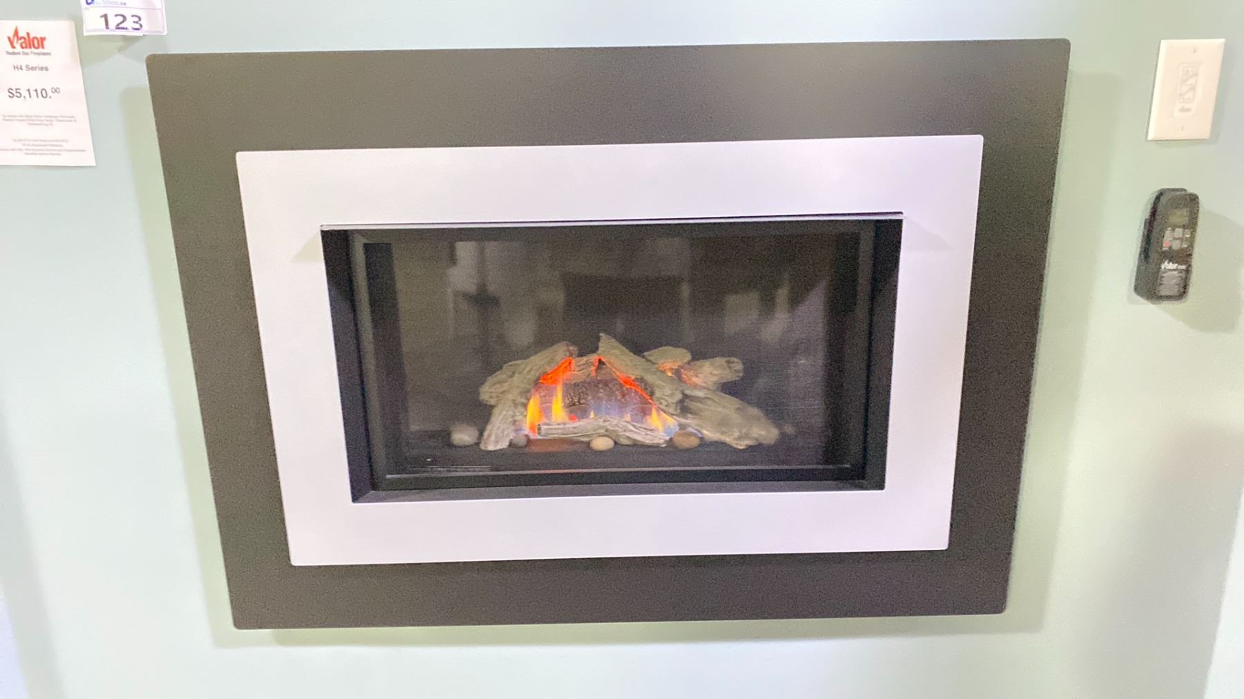 VALOR H4 SERIES FIREPLACE. BLACK OUTER LANDSCAPE SURROUND, POWDER COATED NICKEL INNER BEZEL, FLUTED LINER & DRIFTWOOD LOG KIT. 24,000 BTU TURN DOWN TO 6,500 BTU, 70.9% ENERGUIDE EFFICIENCY, COMES WITH BOTH WALL MOUNTED CONTROL AND PROGRAMMABLE VALORSTAT SYSTEM REMOTE
