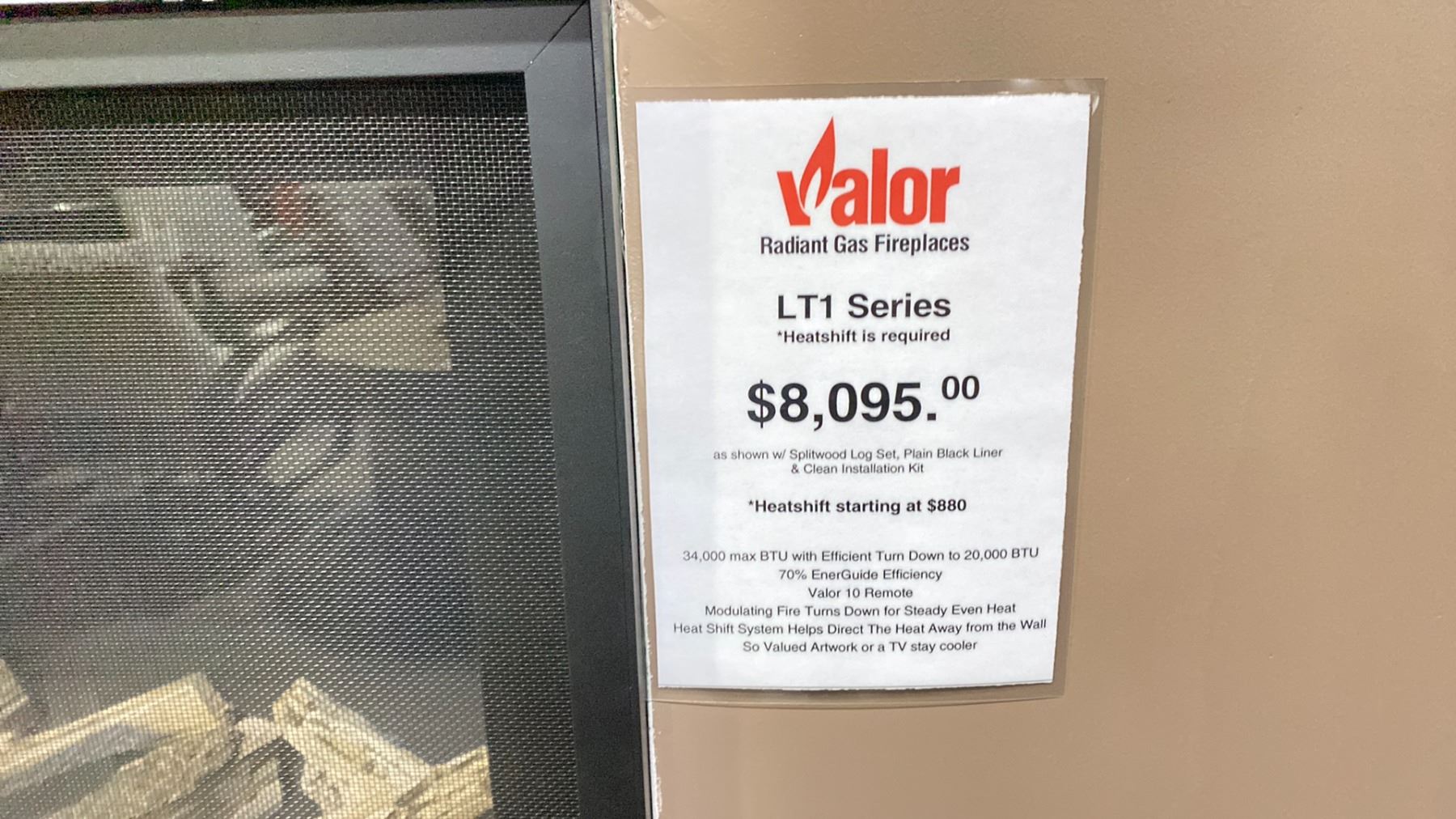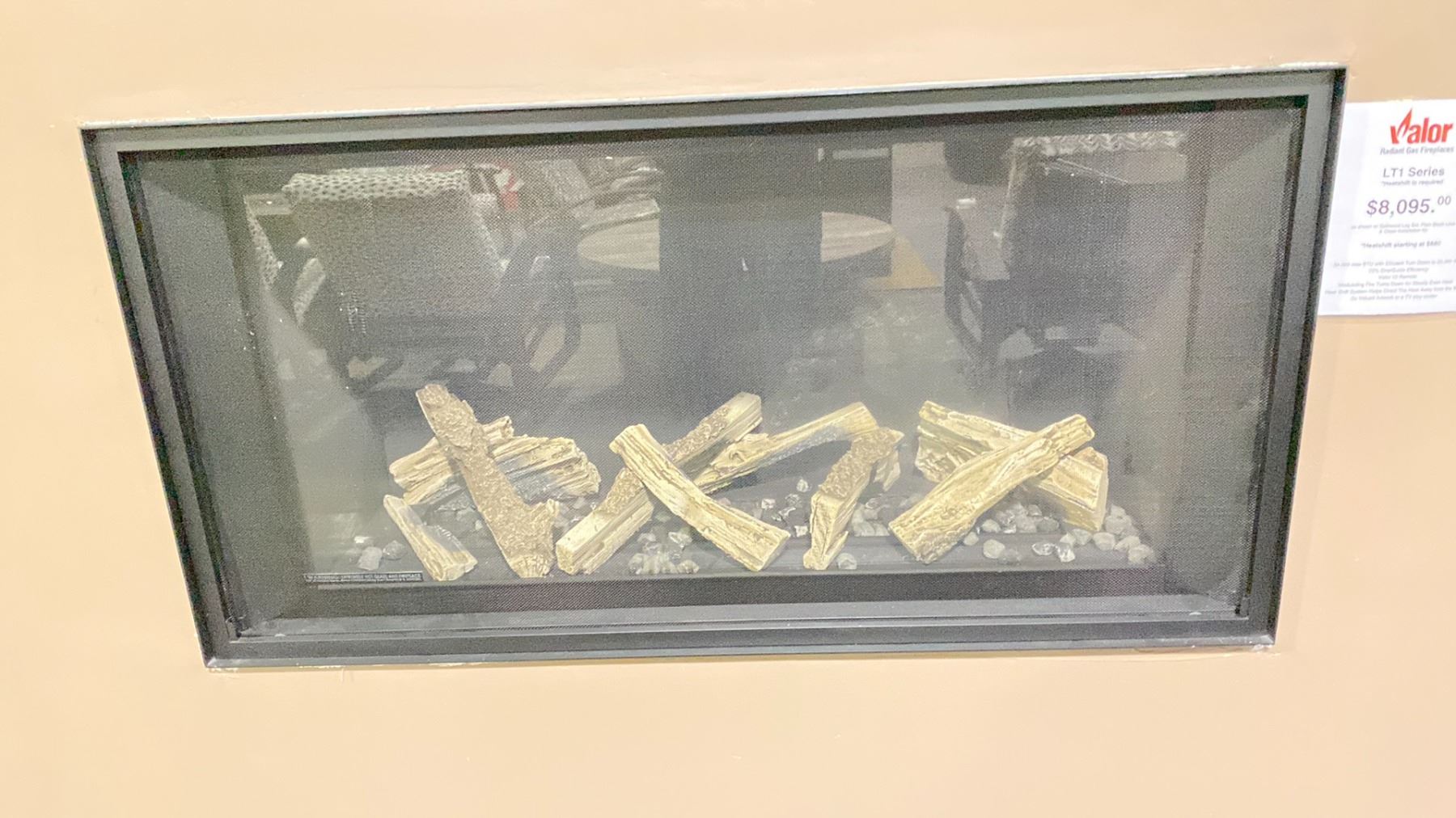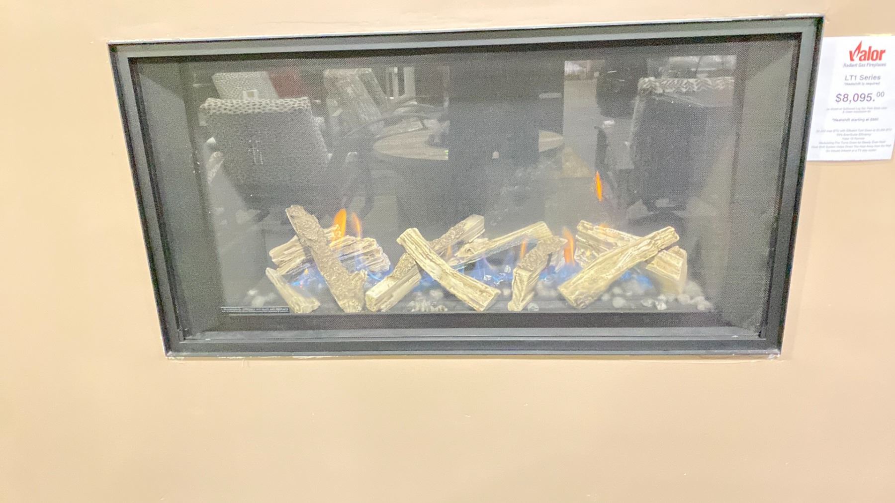 VALOR LT1 SERIES WITH SPLITWOOD LOG SET, PLAIN BLACK LINER. 34,000 BTU MAX WITH EFFICIENT TURN DOWN TO 20,000 BTU, 70% ENERGUIDE EFFICIENCY, REMOTE, MODULATING FIRE TURNS DOWN FOR STEADY EVEN HEAT. WITH HEAT SHIFT SYSTEM TO HELP DIRECT THE HEAT AWAY FROM THE WALL OR TV. RETAILS $8095