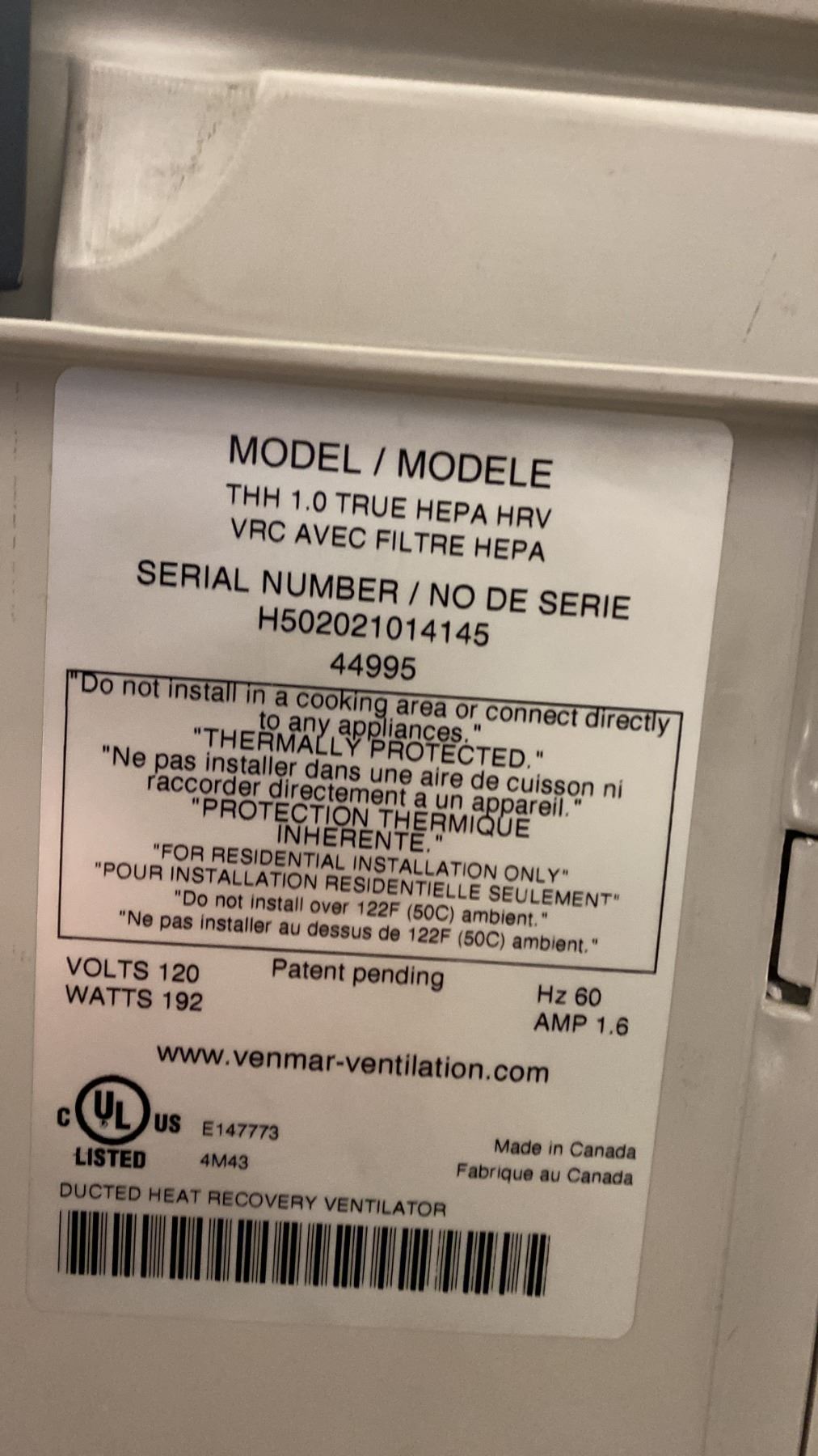 VAN EE TRUE HEPA HRV AIR FILTRATION SYSTEM. MODEL THH 1.0