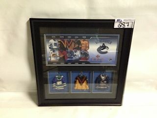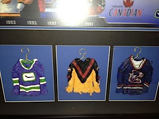 VANCOUVER CANUCKS WALL MOUNT SHOWCASE WITH 3 MINI REPLICA JERSIES AND JERSEY HISTORY