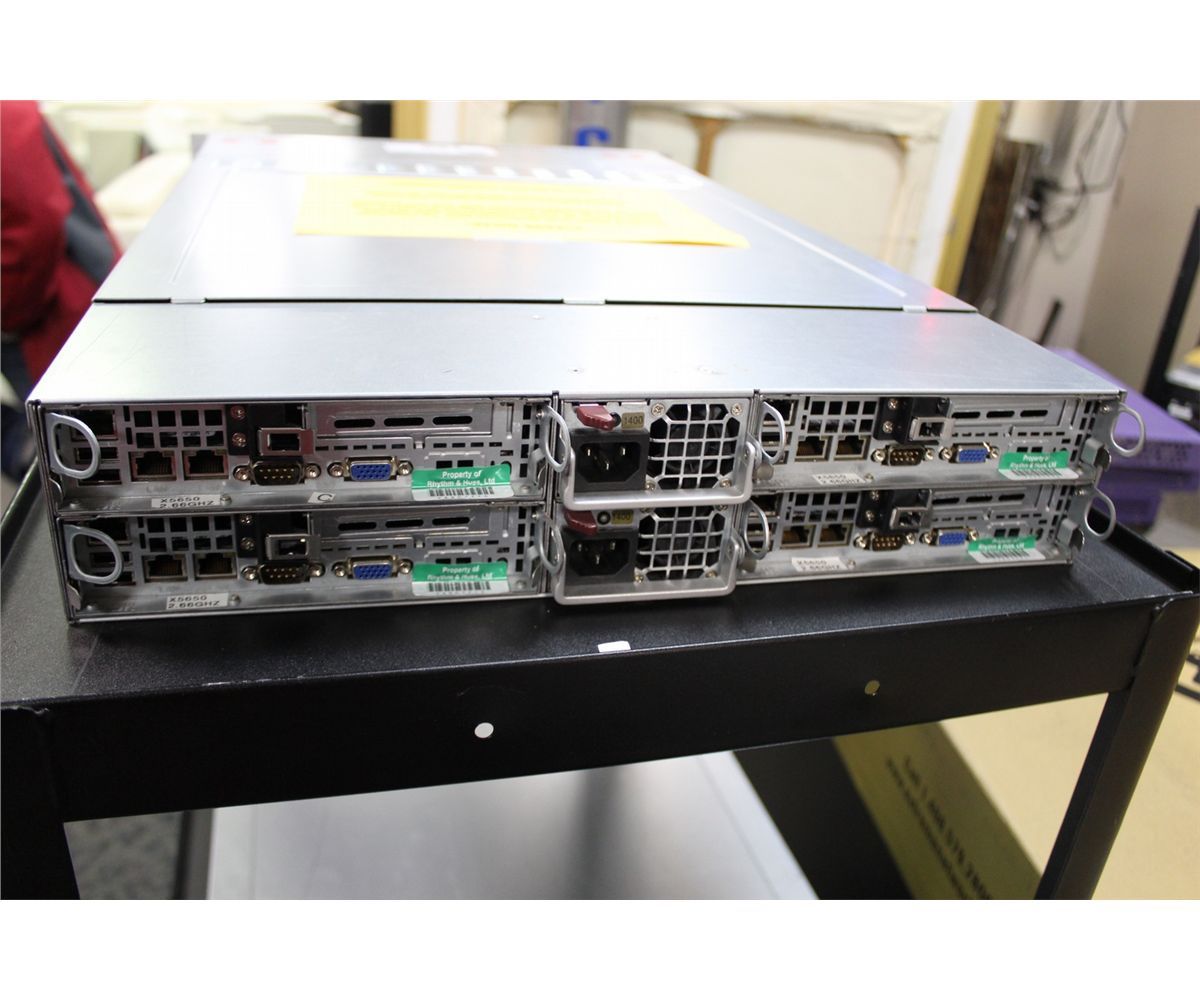 VANR118 4 MOTHERBOARDS/SERVERS PER CHASSIS SUPERMICRO 2U-TWIN SC 827 SUPERMICRO SAS827B 4X SUPERMICRO X8DTT-F 4X INTEL XEON X5450 @ 2.66 GHZ 4X INTEL XEON X5450 @ 2.66 GHZ 4X 48 GB @ 1333 250 GB 8 7200 3 GB/S 2 TB DVD DRIVE