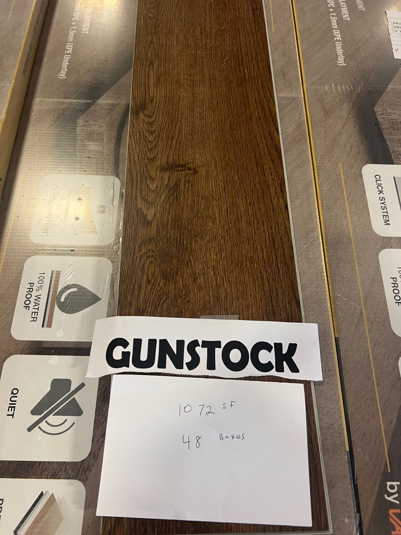 VANWOOD MEGA PLANK IN GUNSTOCK VINYL FLOORING 48 BOXES (20.02SQ. FT. EACH) TOTAL 1072SQ. FT.