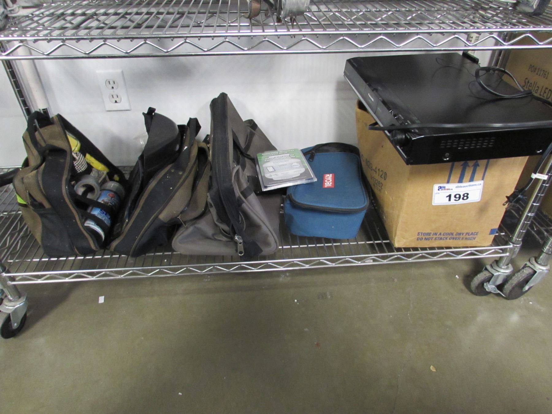 VEHICLE EMERGENCY ROAD SIDE KITS, BOX OF ASSORTED CABLES, CORDS, HDMI DVD PLAYER, ETC