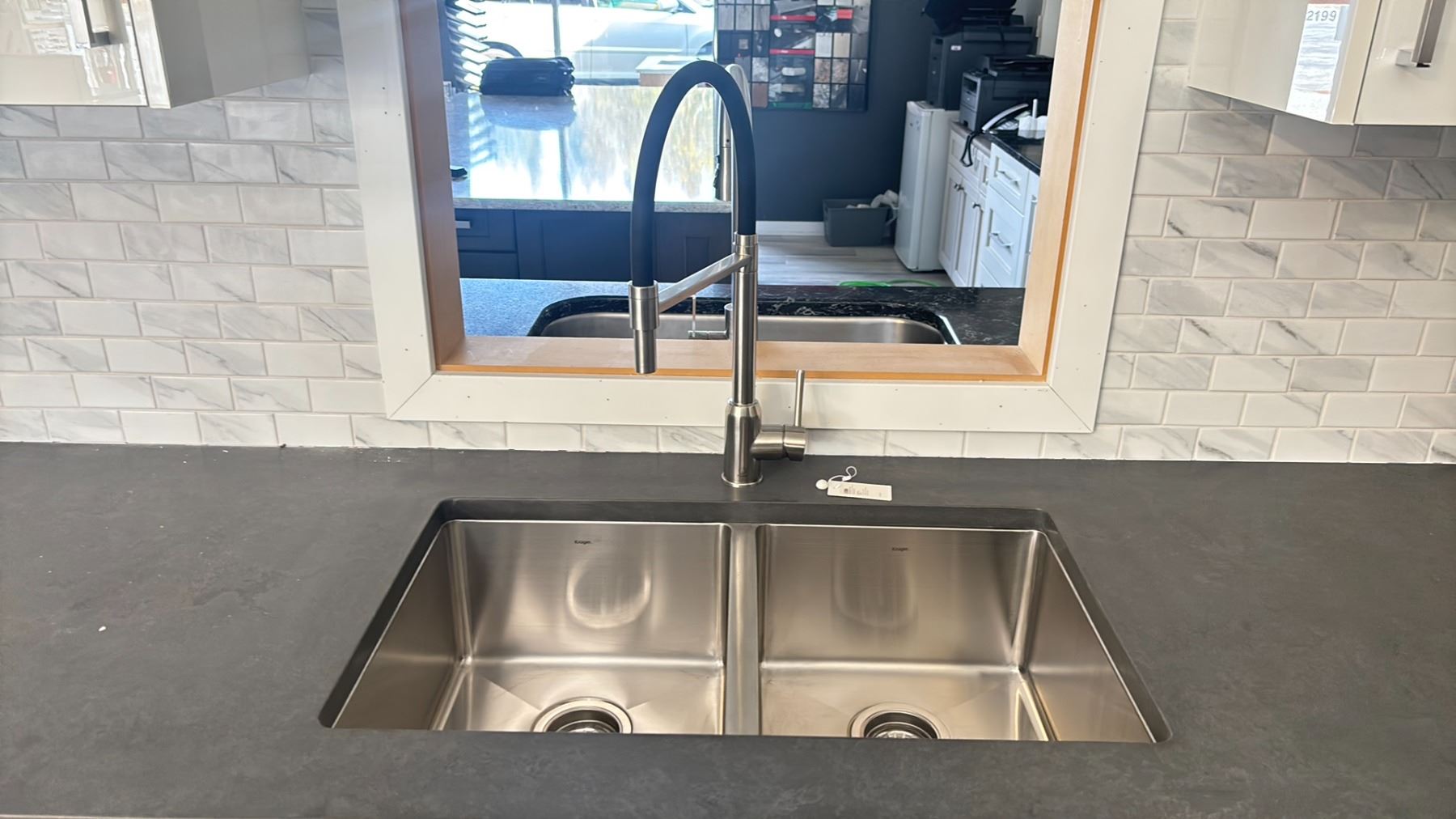 VICOSTONE KITCHEN CABINET SET - GREY W/CHROME HANDLES & GREY STONE COUNTER TOP COMES WITH STAINLESS DOUBLE SINK AND FAUCET SET **DISH WASHER NOT INCLUDED** *APPROX. DIMENSIONS - BOTTOM CABINETS 10FT X 5FT X 3FT/UPPER 5.5FT X 3.5FT X 3FT* AND 3FT X 3FT* CABINETS WILL NEED TO BE REMOVED FROM THE WALL BY THE SUCCESSFUL BIDDER - PLEASE BRING TOOLS, MANPOWER