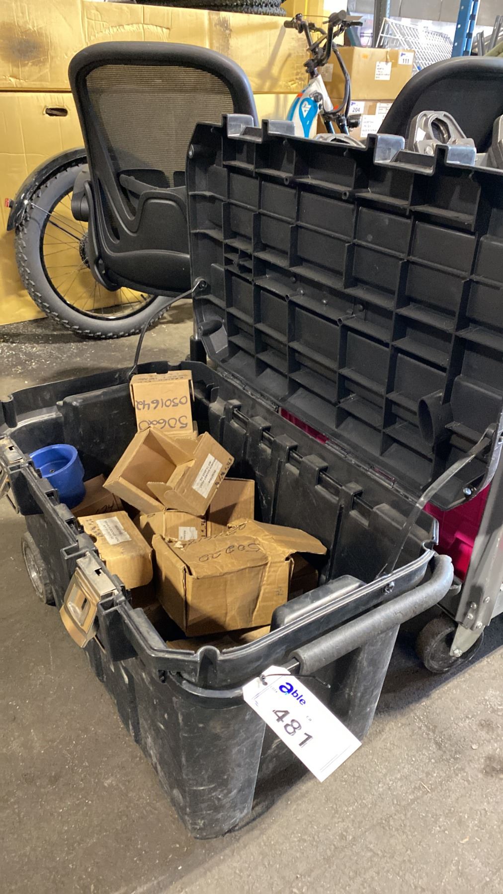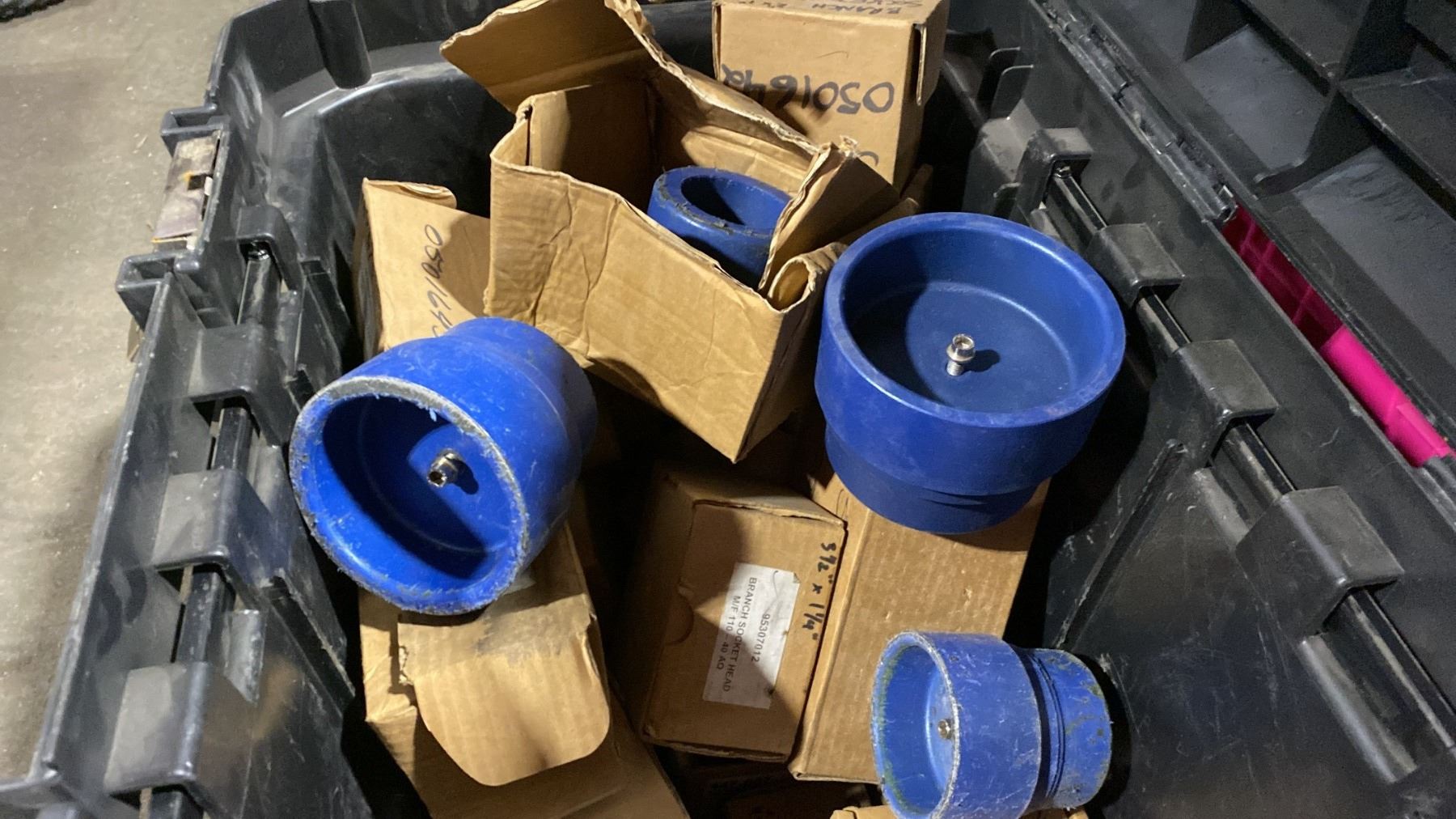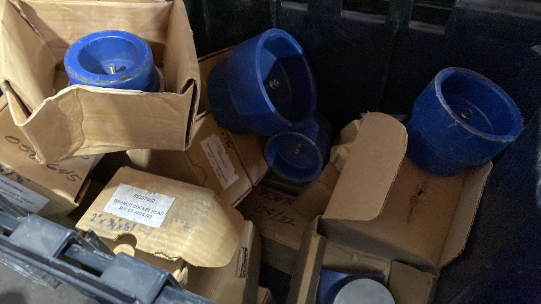 VICTAULIC BLACK PLASTIC MOBILE TOOL BIN WITH ASSORTED BRANCH SOCKET HEADS/TRANSITION PIPE ADAPTERS