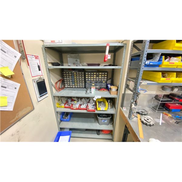 4' X 2' X 6' METAL SHELF WITH CONTENTS. NUTS AND BOLTS, HELICOILS, FUSES, FITTINGS, SQUARE KEYS, ETC