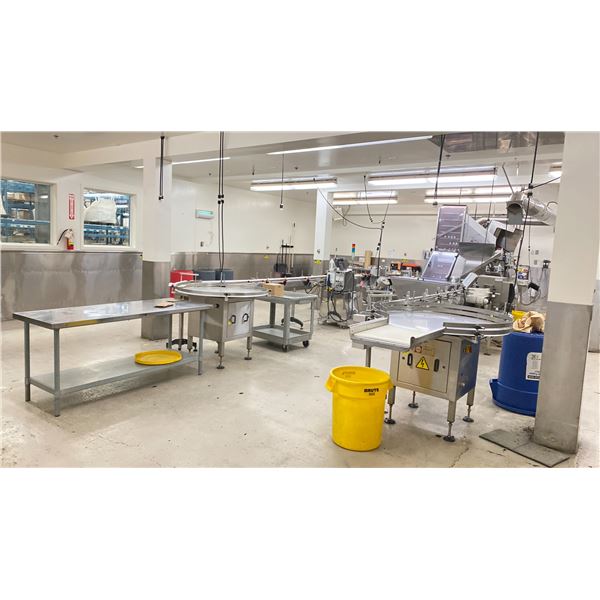 CAPMATIC AUTOMATED INTEGRATED BOTTLE CAPPING, LABELING, CODING, METAL DETECTING LINE. CAPMATIC ROUND FEED TABLE, AESUS CONVEYOR, CAPMATIC CAPPER WITH