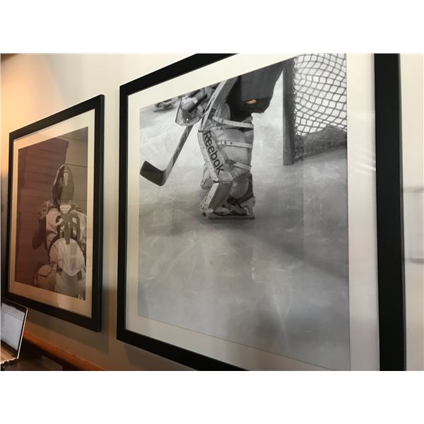 2 X BLACK AND WHITE SPORTS ACTION PRINTS. GOALIE AND BASEBALL CATCHER. APPROX 42' X 42"