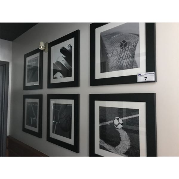 6 BLACK AND WHITE SPORTS PRINTS. 19" X 19"