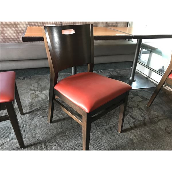WOOD AND RED UPHOLSTERED CHAIR. HOLSAG CANADA BRAND- MADE IN CANADA