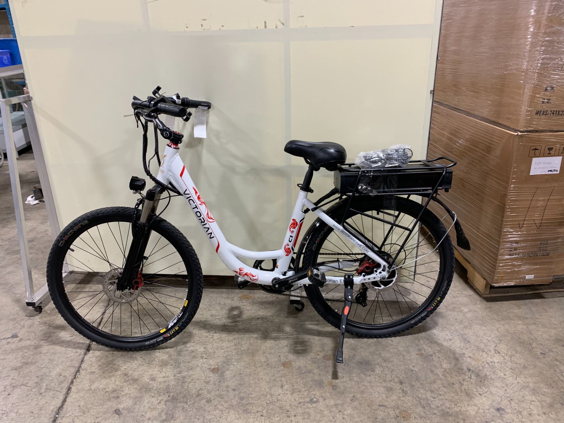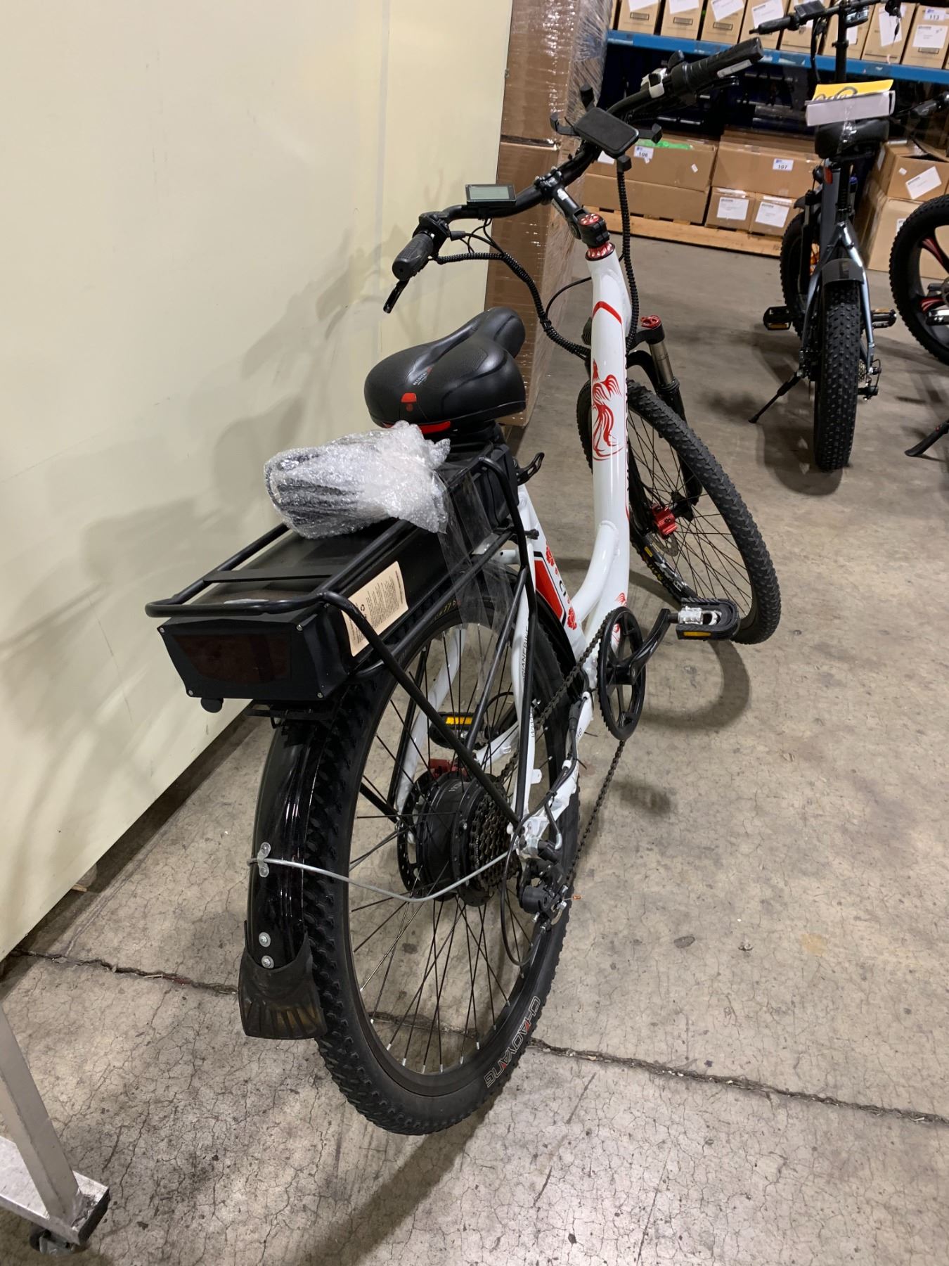 VICTORIAN C1 WHITE/RED ELECTRIC BIKE, 500W, 32 KMH MAX SPEED, 48 VOLT BATTERY, UP TO 65 KM RANGE, 26" TIRES, DYISLAND FRONT/BACK DISC HYDRAULIC BRAKES, 7 GEARS, 6061 ALUMINUM ALLOY FRAME, 48LBS WEIGHT, FRONT SUSPENSION ( *IN BOX* )