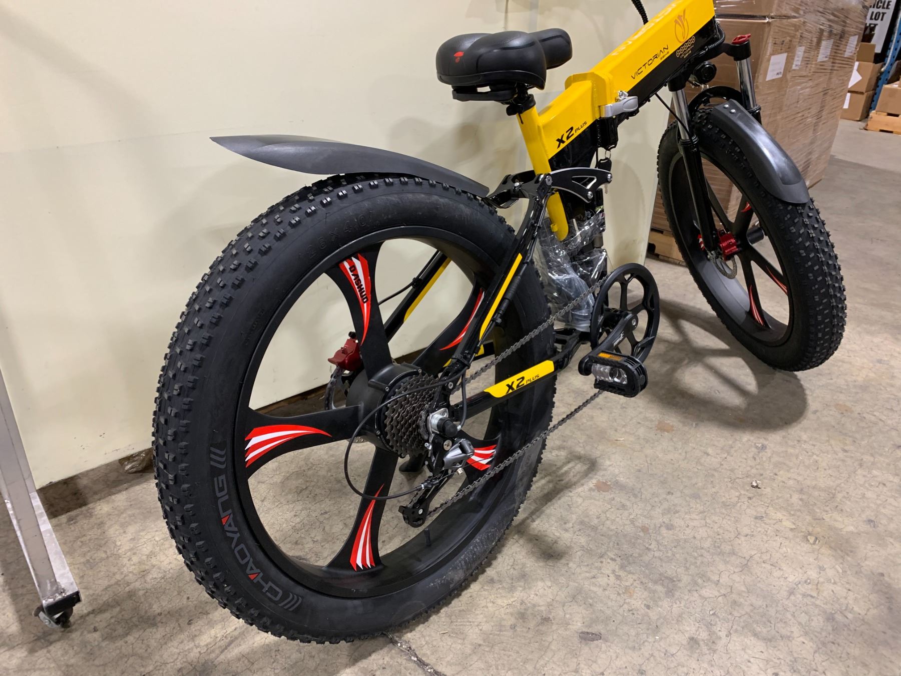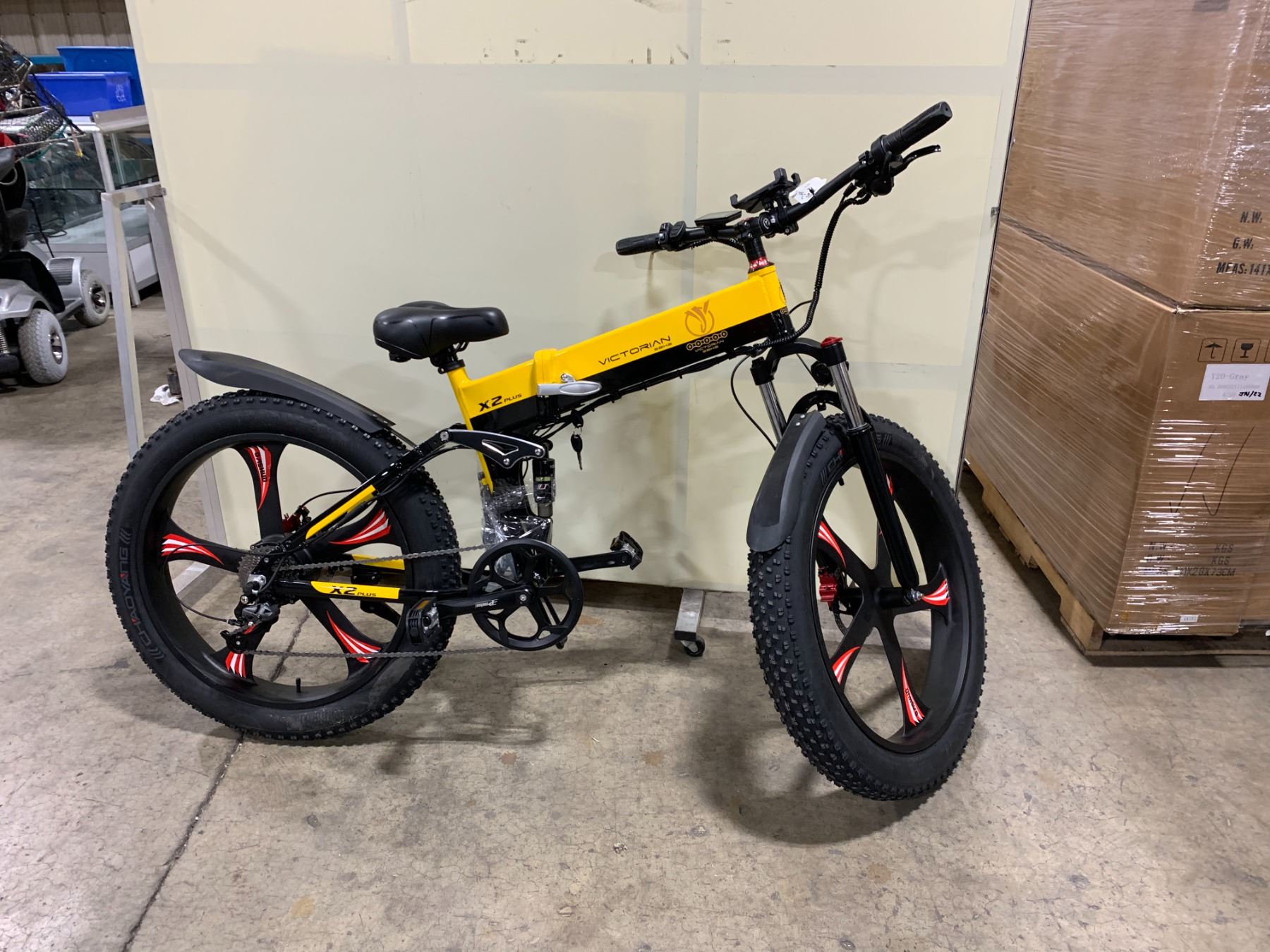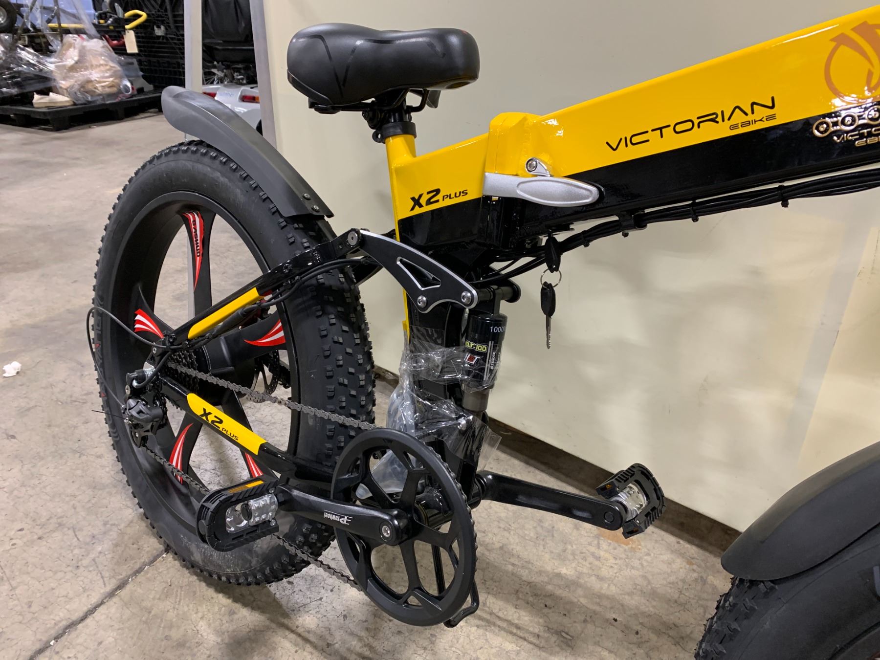 VICTORIAN EBIKE X2 PLUS YELLOW/BLACK FOLDING FULL SUSPENSION ELECTRIC BIKE WITH FULL DISC BRAKES, BATTERY-48V 13AMP, 1000 WATT MOTOR, MAX SPEED-32KM/H, TIRE: 26 X 4, RANGE: UP TO 55KM, LOADING CAPACITY: 340LBS