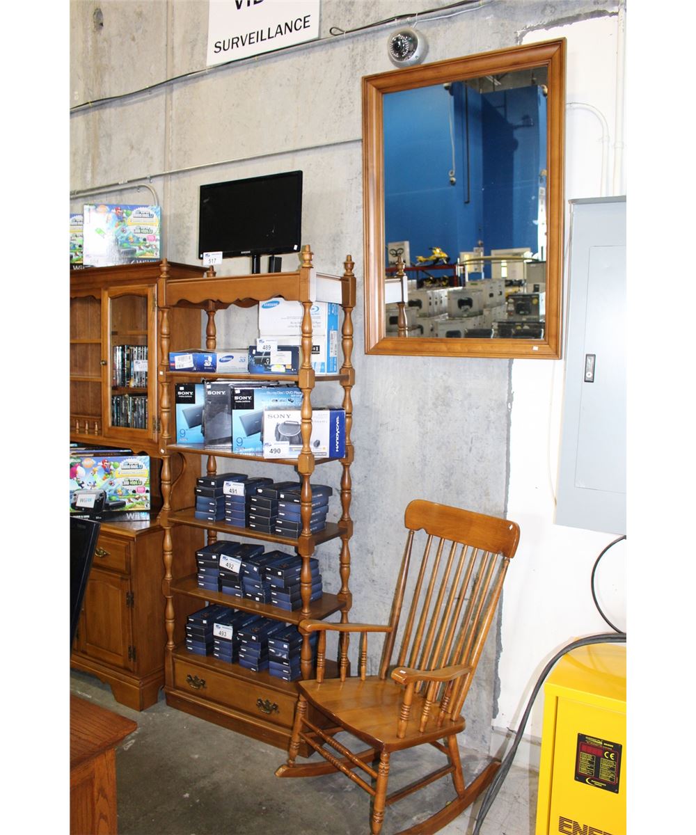 VILAS MAPLE APPROX 7' TALL SHELVING UNIT COMPLETE WITH SOLID MAPLE FRAMED MIRROR AND SOLID MAPLE ROCKING CHAIR