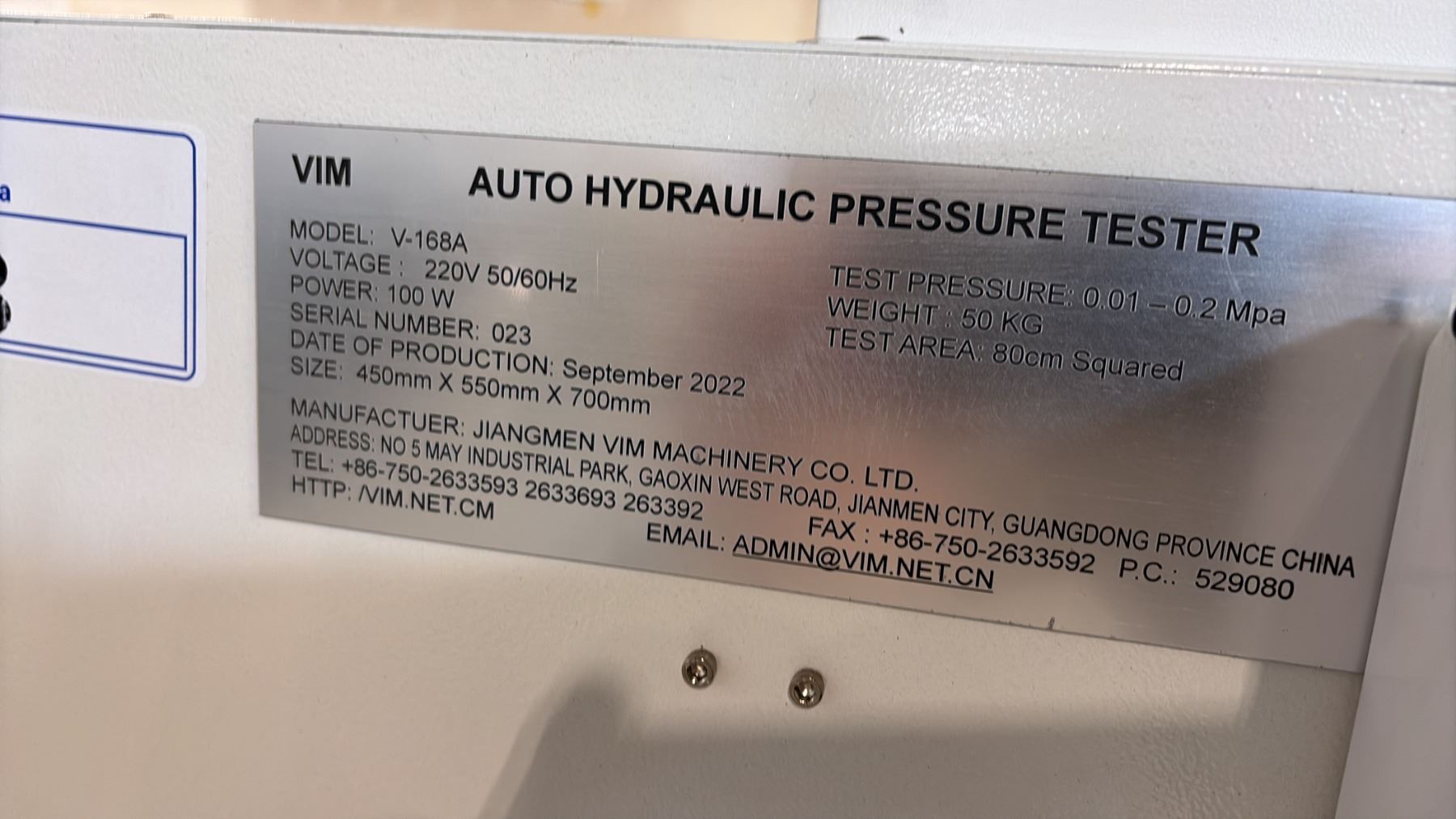VIM V-168A TESTING WATER PRESS MACHINE