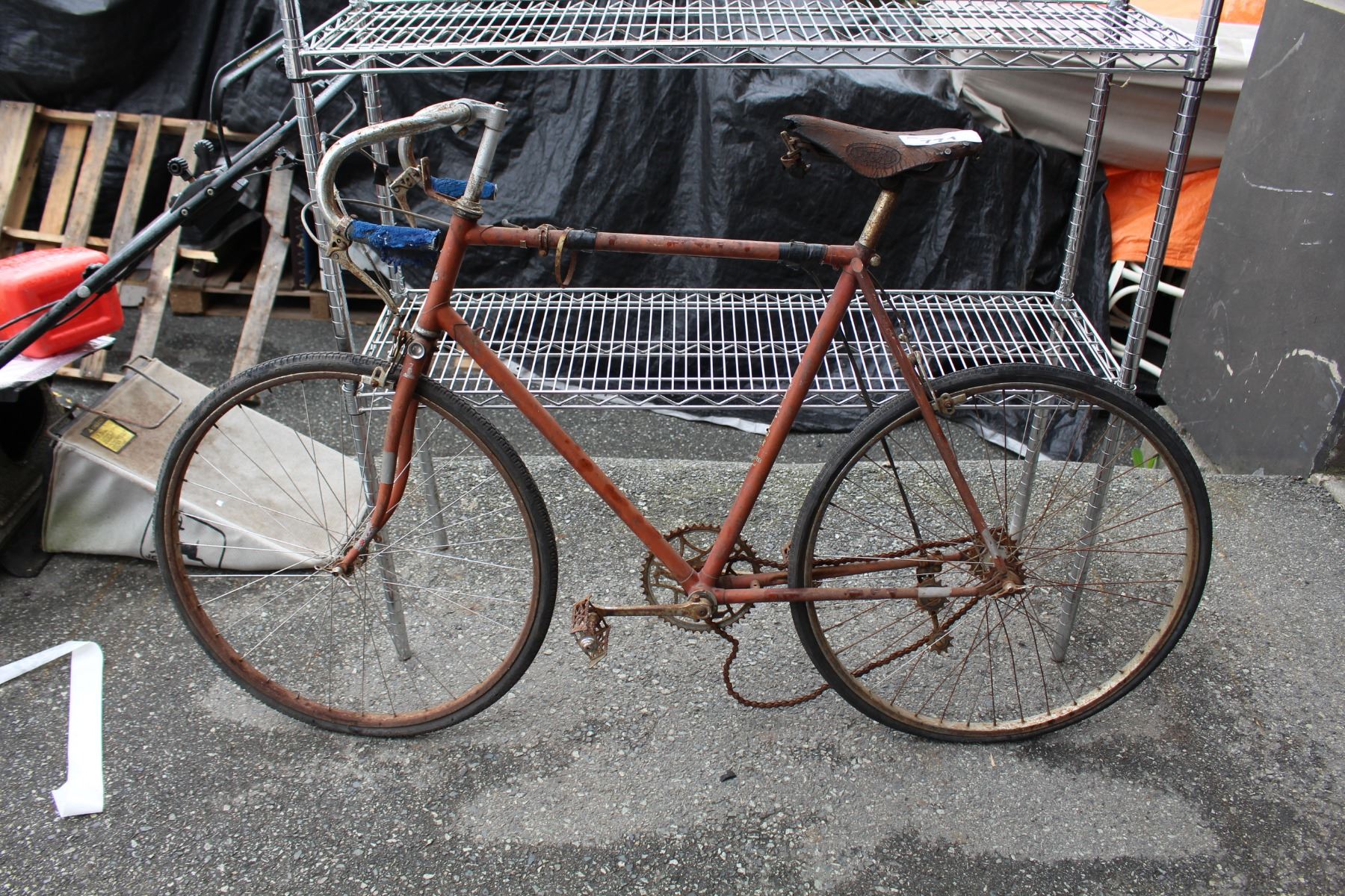 VINTAGE 10 SPEED BIKE AND METAL SHELVING