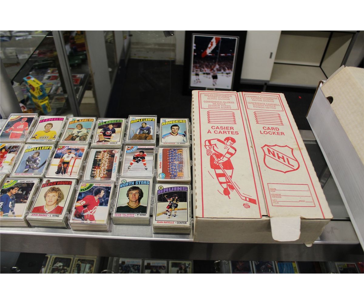VINTAGE 16 TEAM MAIL AWAY LOCKER, WITH NEAR COMPLETE SETS OF 1975-76 AND 1977-78 OPC HOCKEY