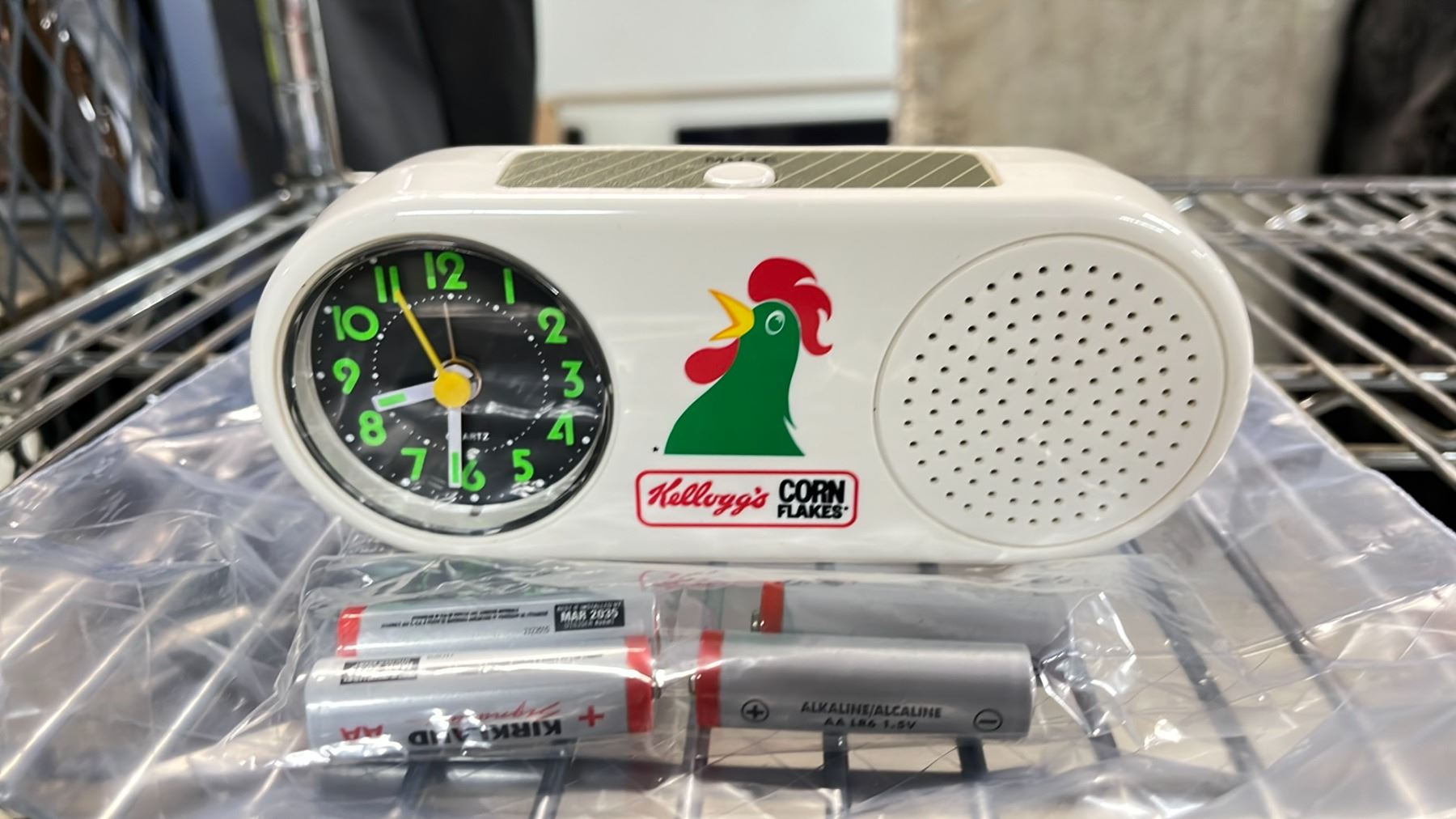 VINTAGE 1991 KELLOGG'S ROOSTER ALARM CLOCK - 7" X 3" X 1 1/2" ( CLOCK KEEPS GOOD TIME, ALARM WORKS, ROOSTER CROWS VERY LOUD )