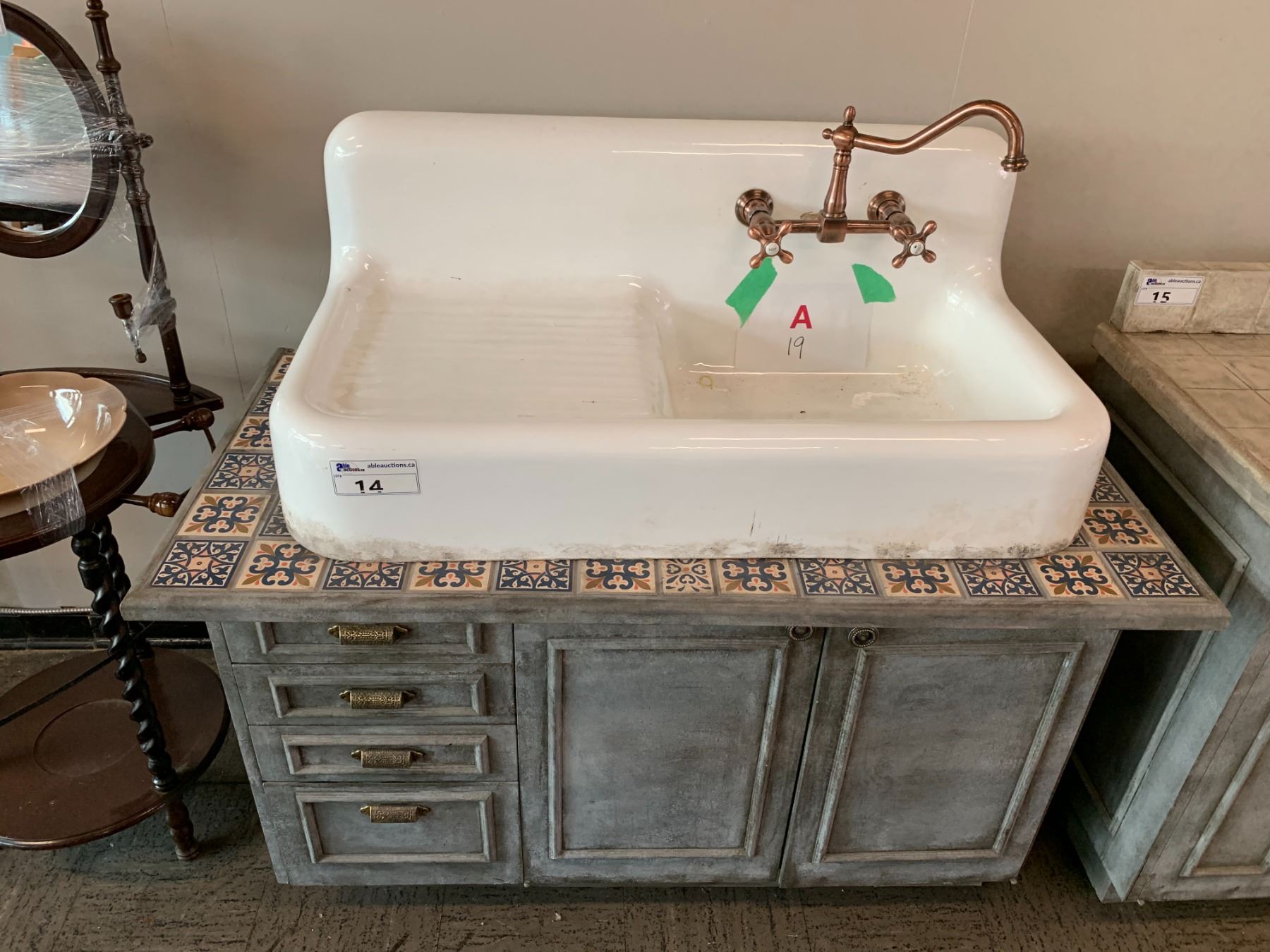 VINTAGE CERAMIC WASH STATION & 2 DOOR 4 DRAWER WOOD BATHROOM CABINET APPROX 46"X52"X26"