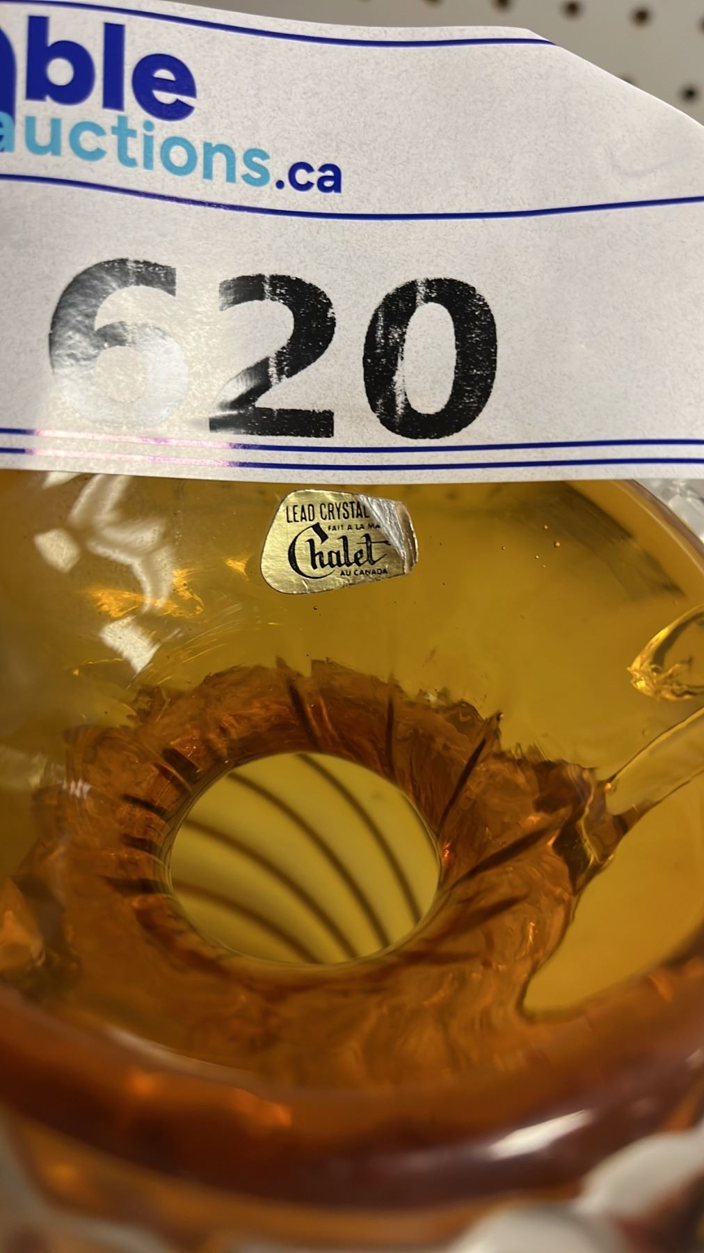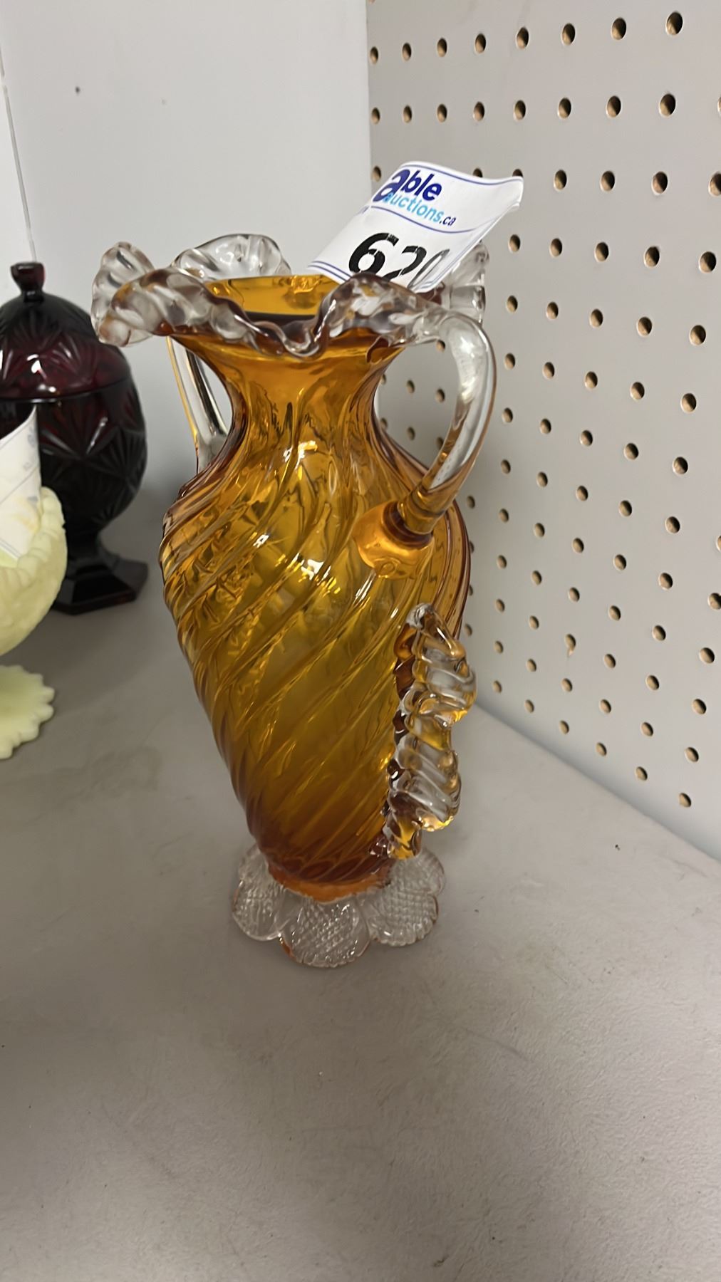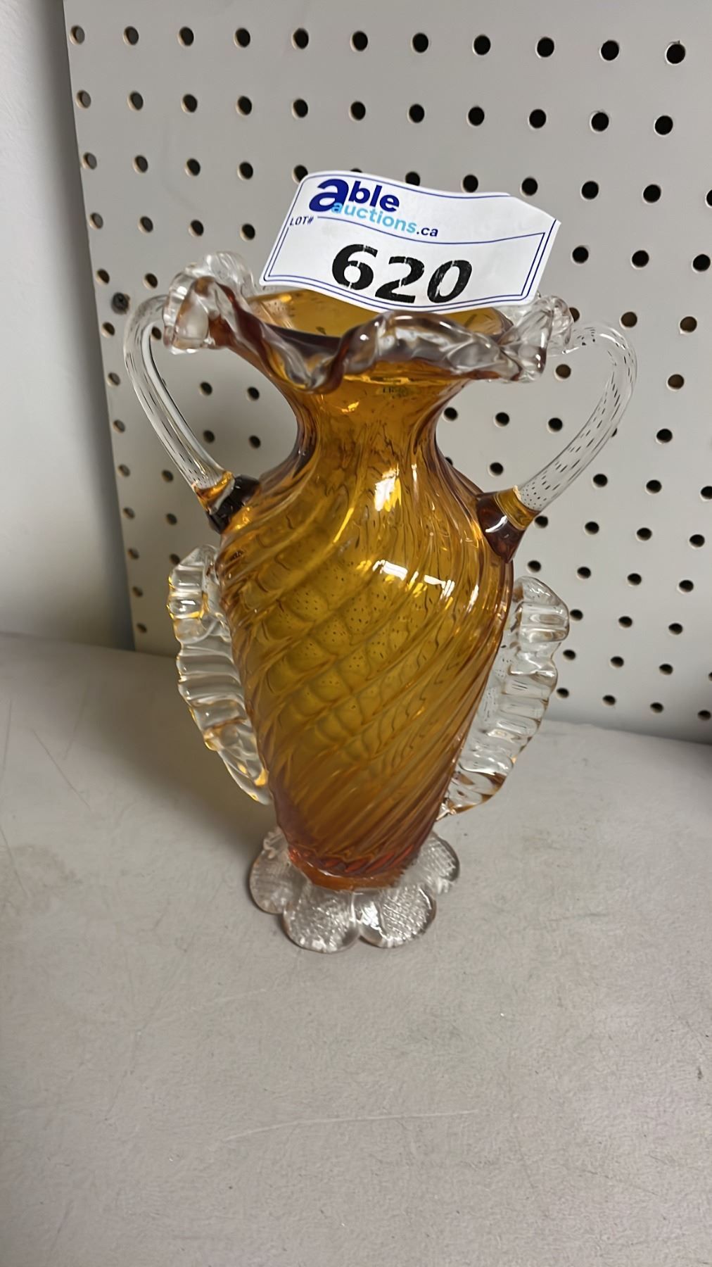 VINTAGE CHALET LEAD CRYSTAL AMBER SWIRL VASE WITH RUFFLED EDGES: APPROX. 10" TALL
