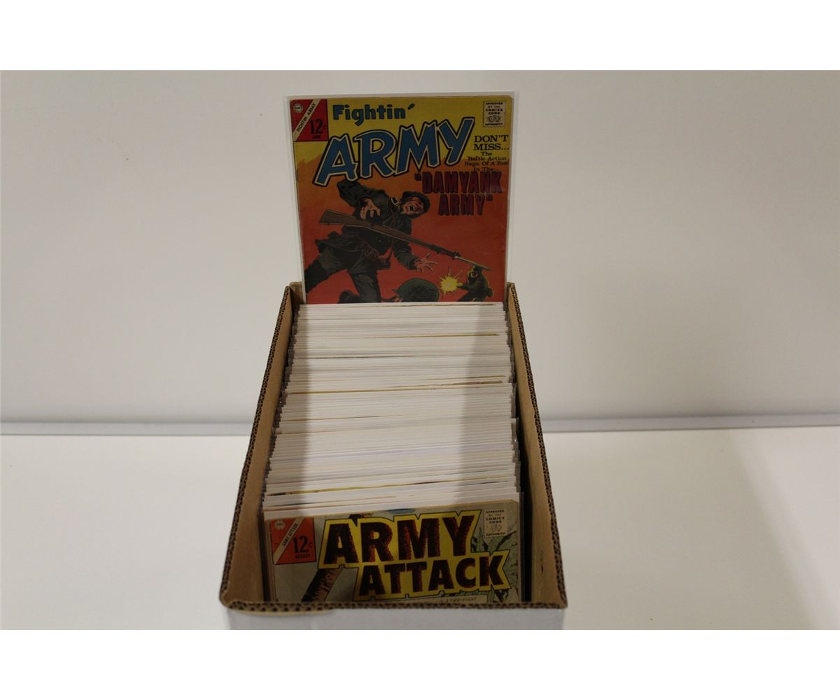 VINTAGE CHARLTON COMICS WAR & WESTERN SHORT BOX (1960'S-80'S) SILVER & BRONZE AGE SHORT BOX FULL OF RUNS FROM THE 2 GENRES, NO DUPLICATES! FEATURING A SLEW OF INDUSTRY TALENT - INCLUDES 3 #1'S. MIXED GRADES, GLOSSY, TIGHT & SUPPLE, LOTS OF OVERSTREET GUIDE VALUE, CHOICE BOX!