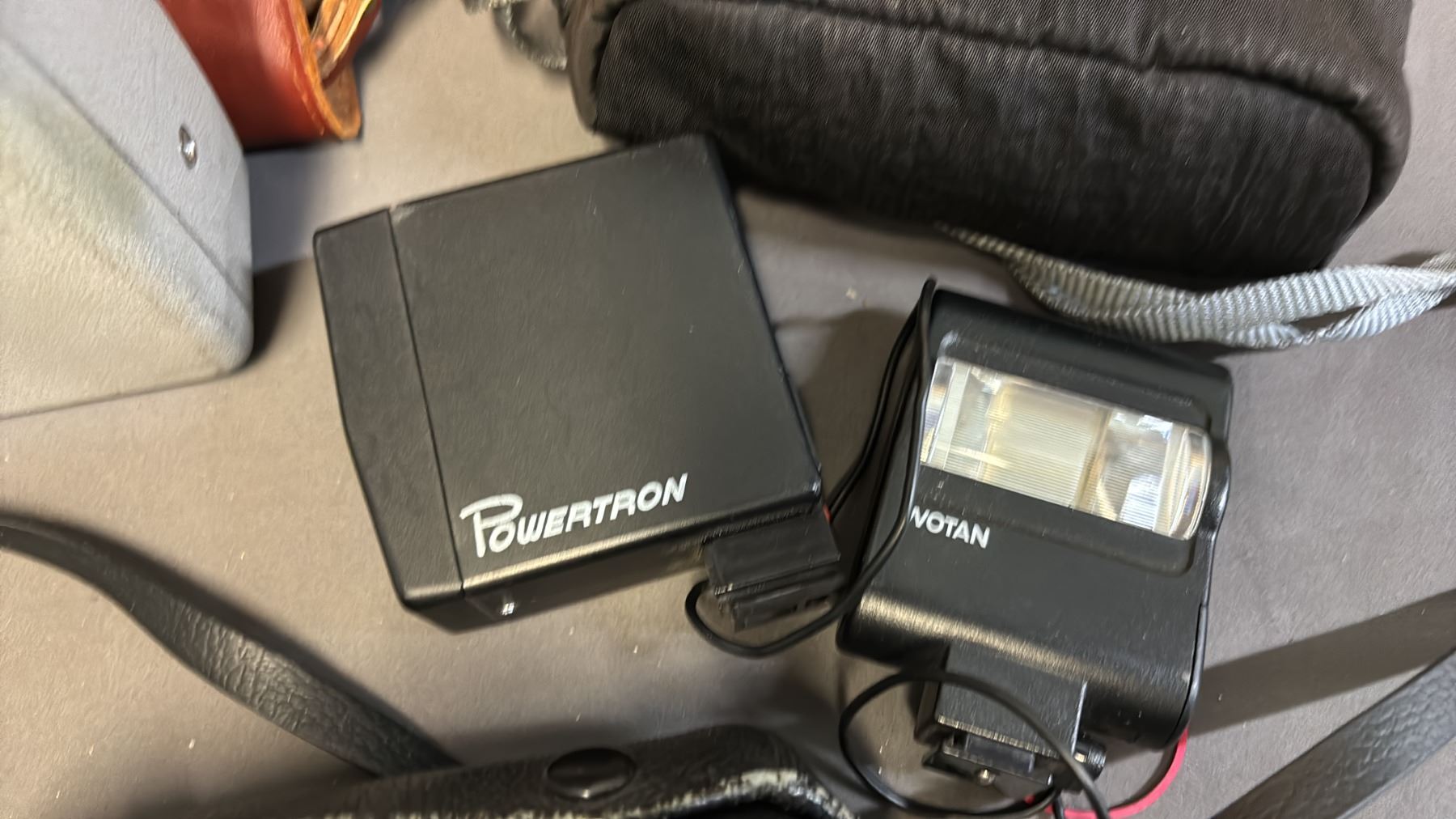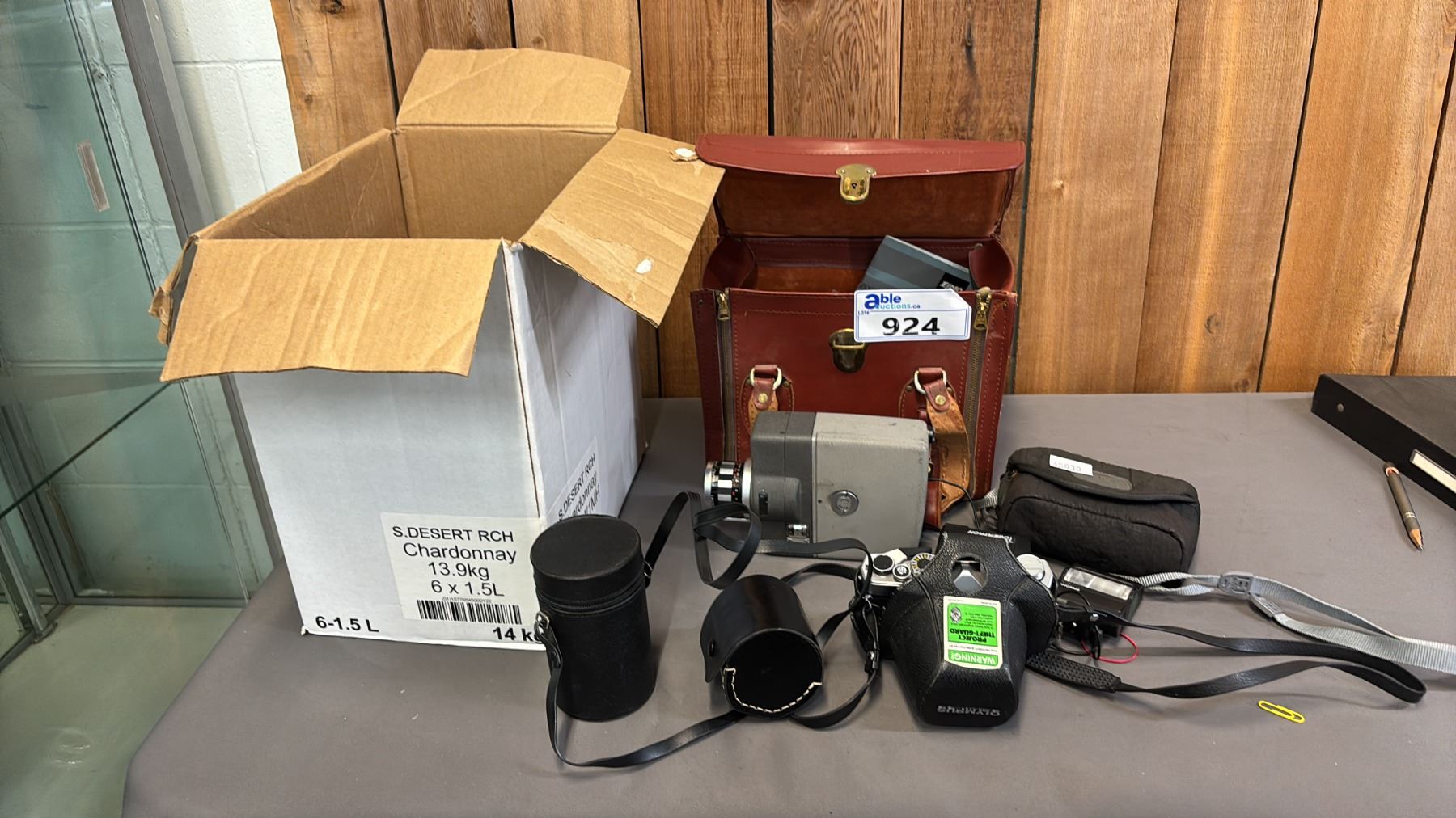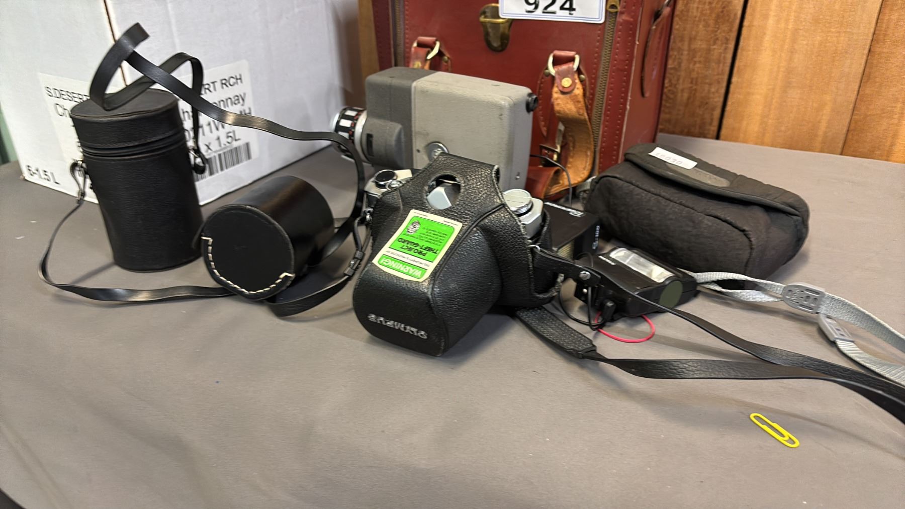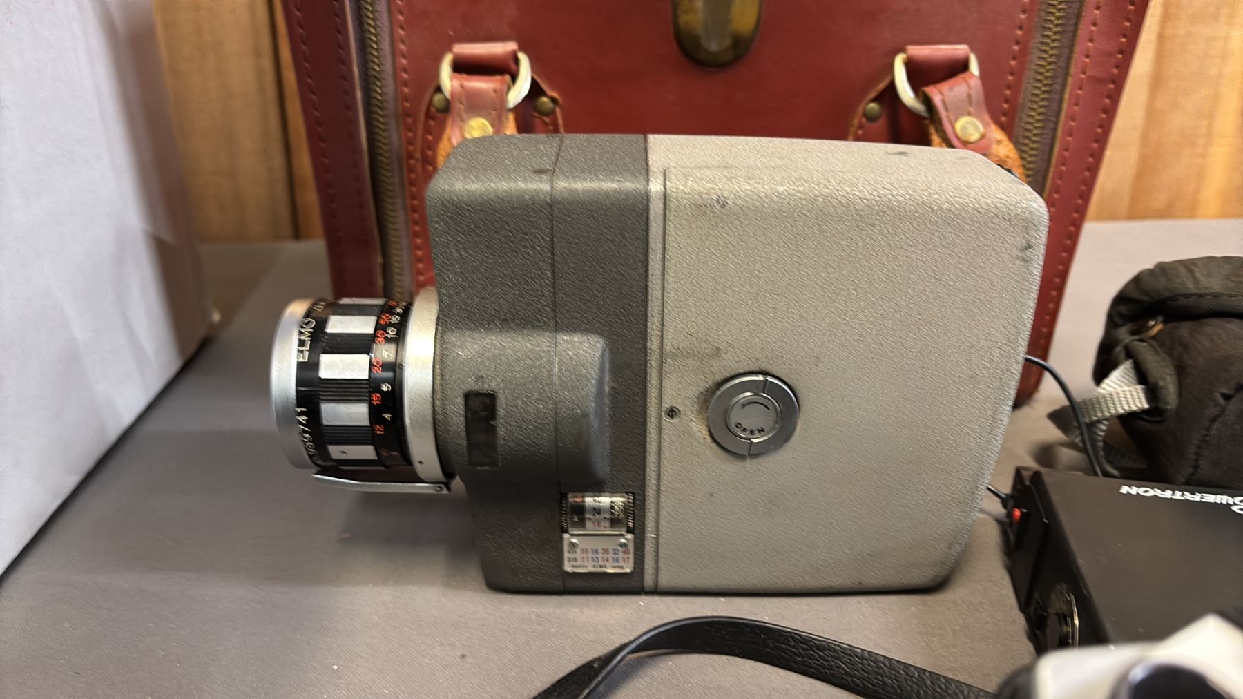 VINTAGE ELMO 8S VIDEO CAMERA W/CASE, 2 VINTAGE FILM CAMERAS, 2 VINTAGE LENSES & MORE