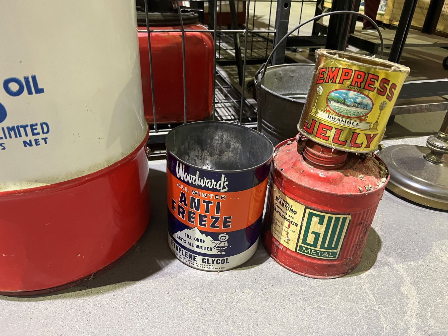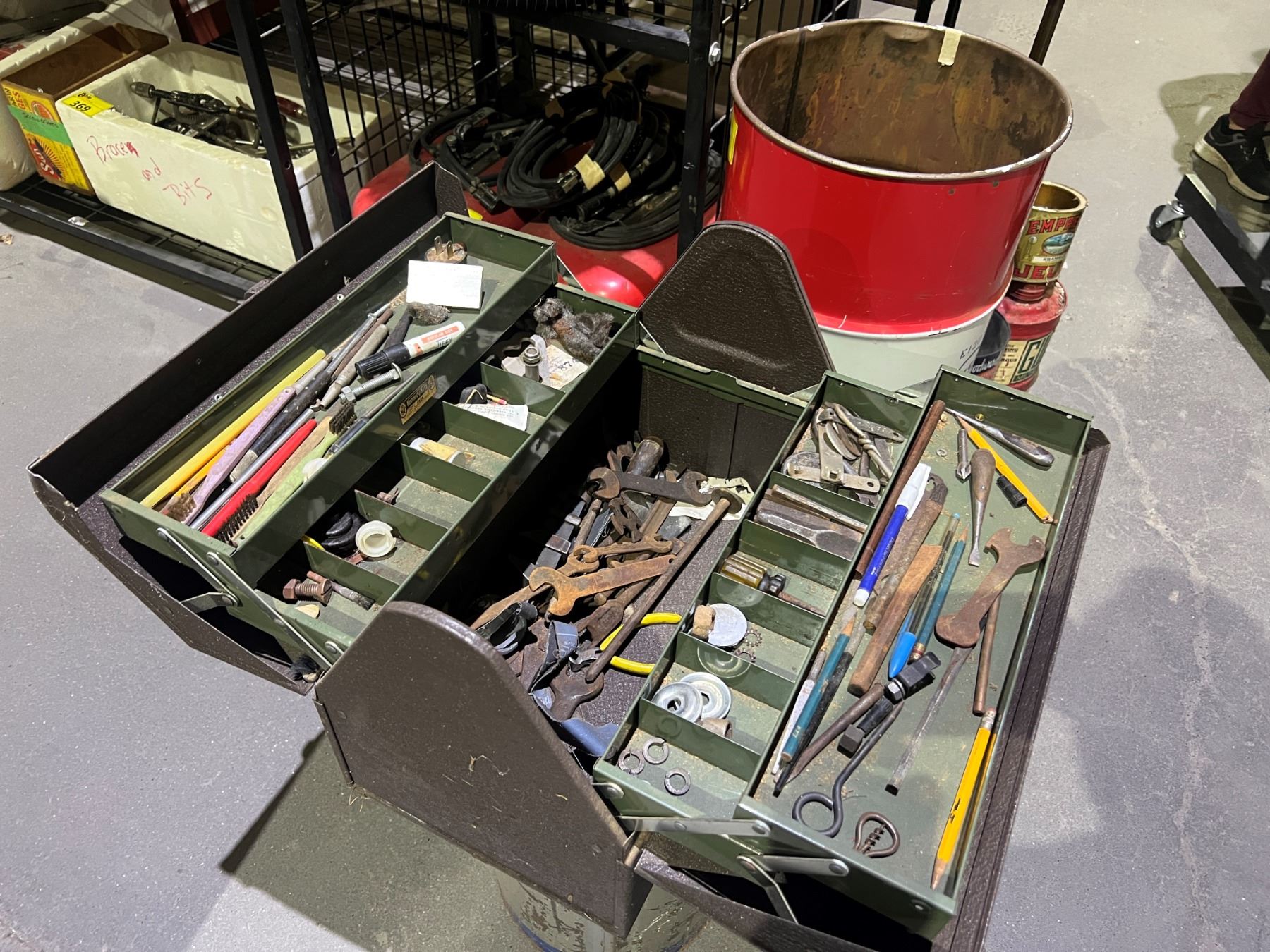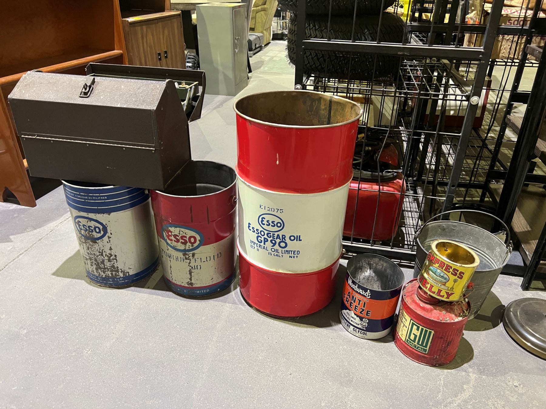 VINTAGE ESSO METAL BARREL WITH CONTENTS AND TOOL BOX WITH CONTENTS