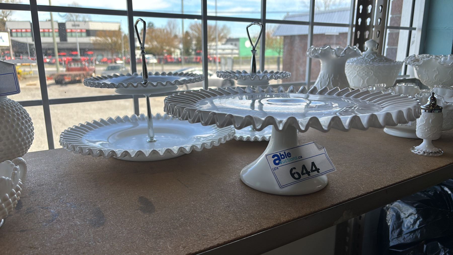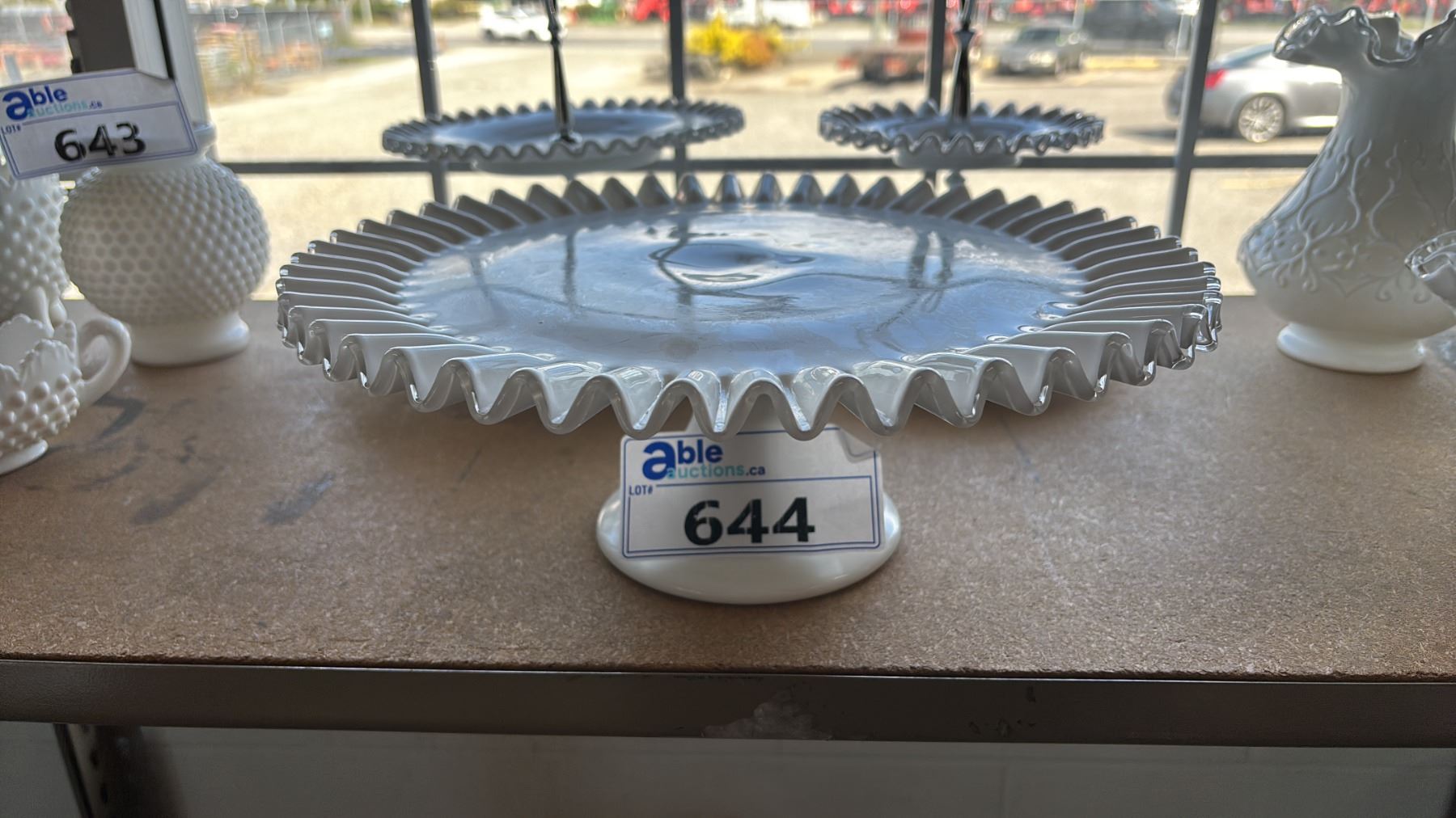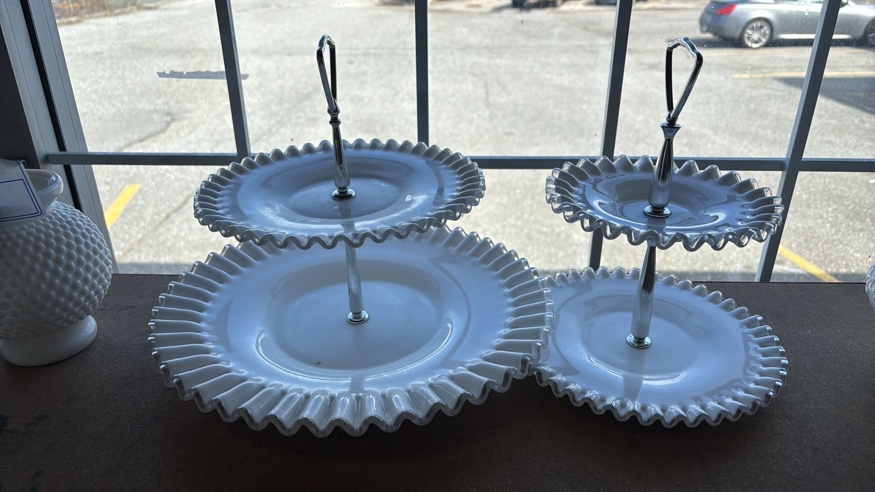 VINTAGE FENTON MILK GLASS CAKE STAND & PAIR OF VINTAGE FENTON 2-TIER DESSERT STANDS