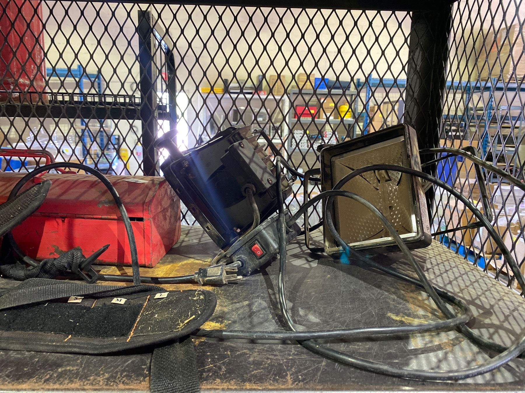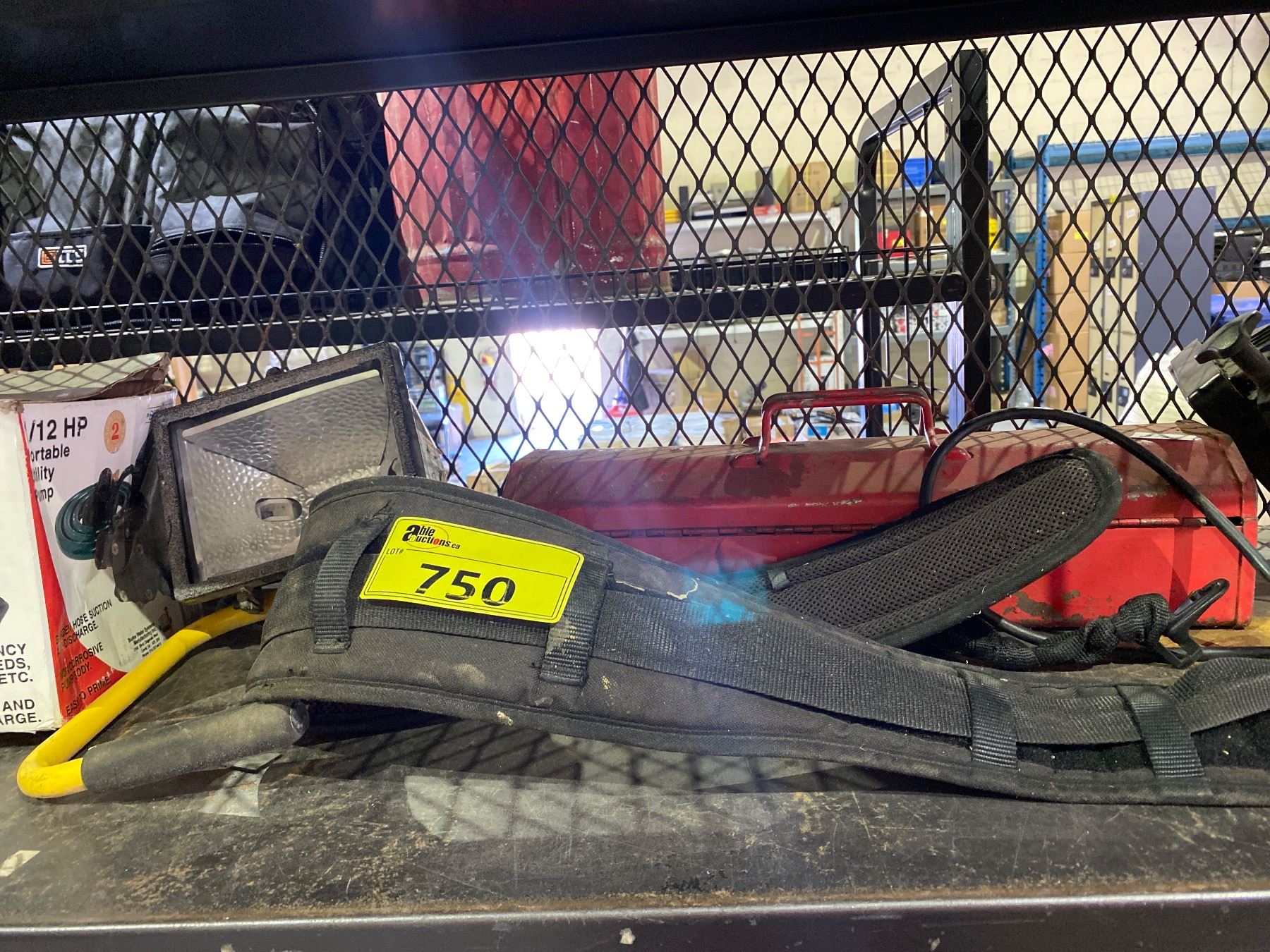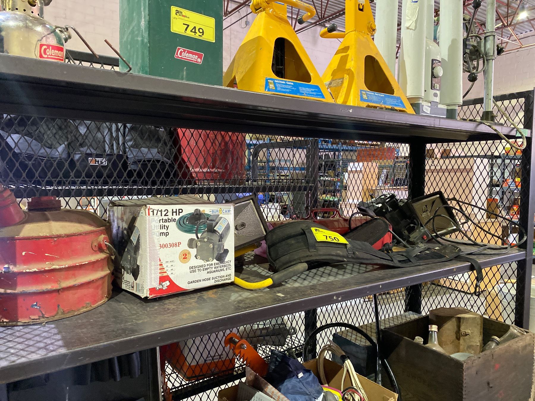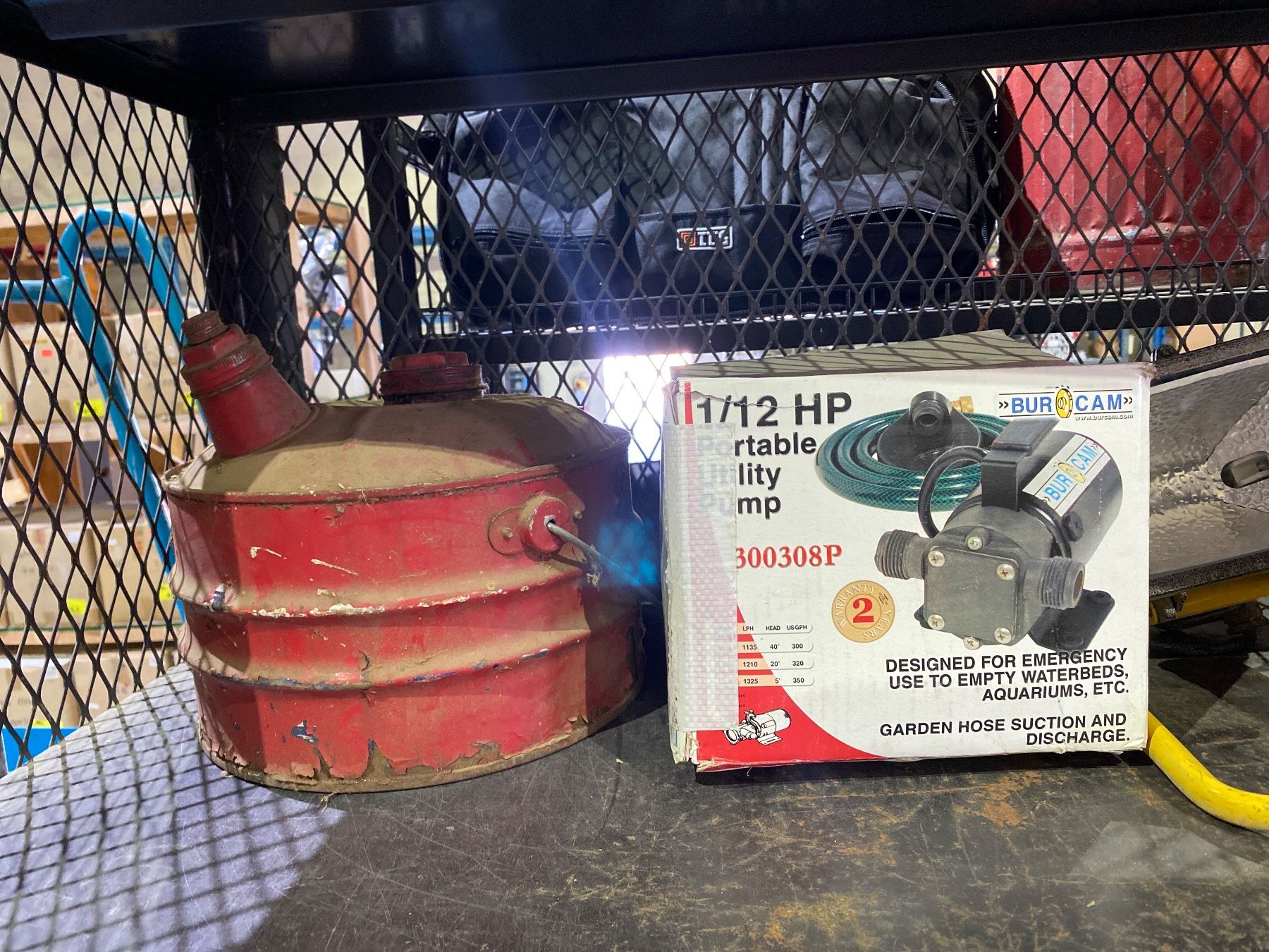 VINTAGE GAS CAN, UTILITY PUMP, WORK LIGHTS AND MORE